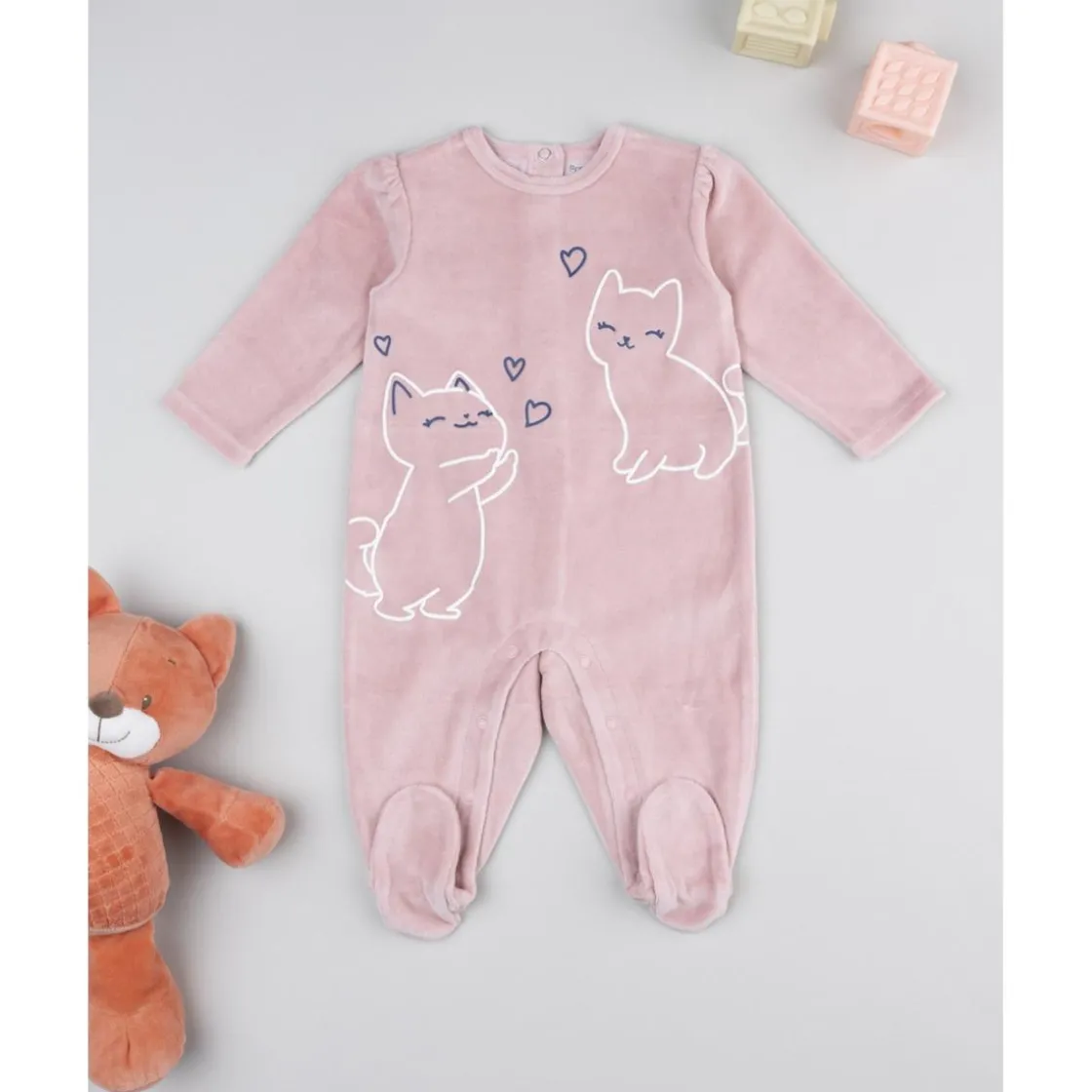 El pijama entero para niña en terciopelo rosa, con pies incluidos, une suavidad y funcionalidad. El estampado de gatitos añade ternura, mientras los automáticos en la espalda y en la entrepierna agilizan el cambio. Ideal para mantener una temperatura agradable durante el descanso. Certificado Oeko‑Tex para mayor tranquilidad.