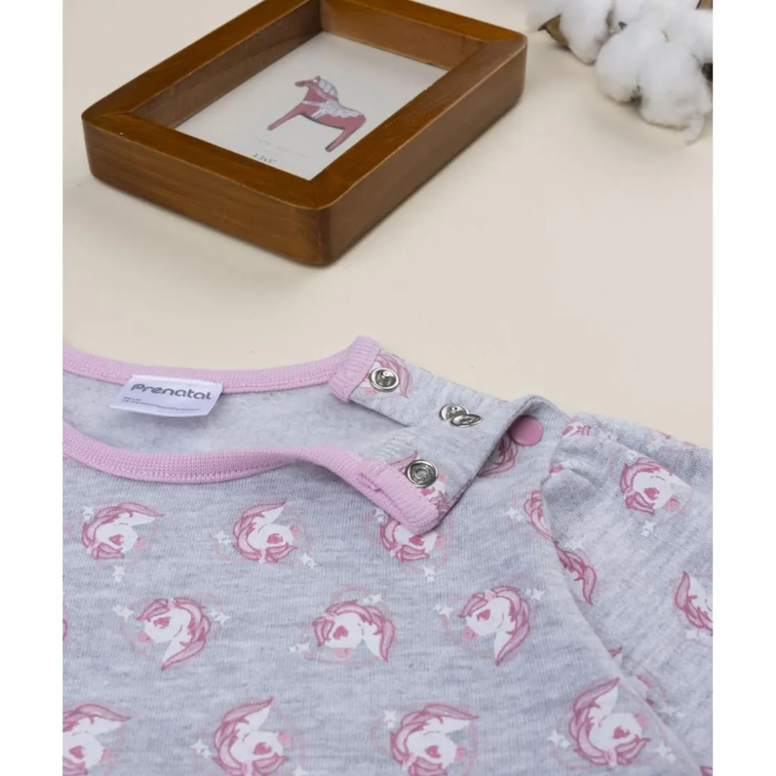 Tierno pijama de dos piezas para niña compuesto por camiseta gris con estampado allover de unicornios y pantalón rosa con cintura elástica. Su tejido suave proporciona calidez y confort nocturno.