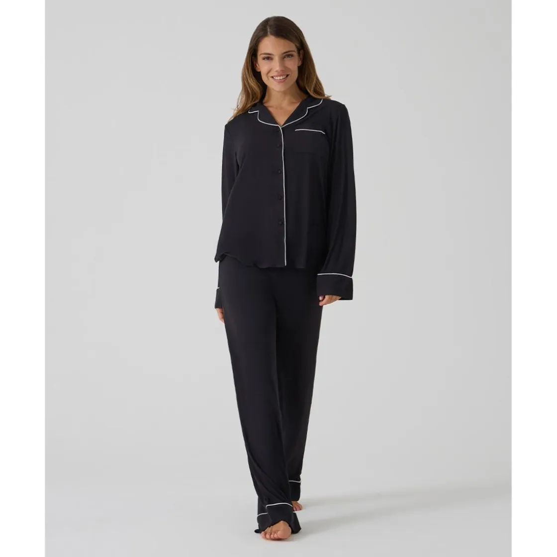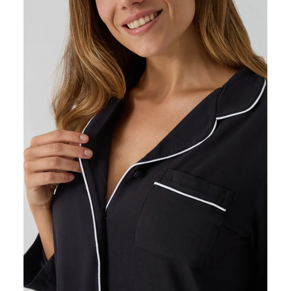 El pijama premamá negro de dos piezas es elegante, cómodo y funcional. De manga larga, con bordes blancos en contraste y un pequeño bolsillo frontal, resulta ideal para el embarazo y la lactancia.