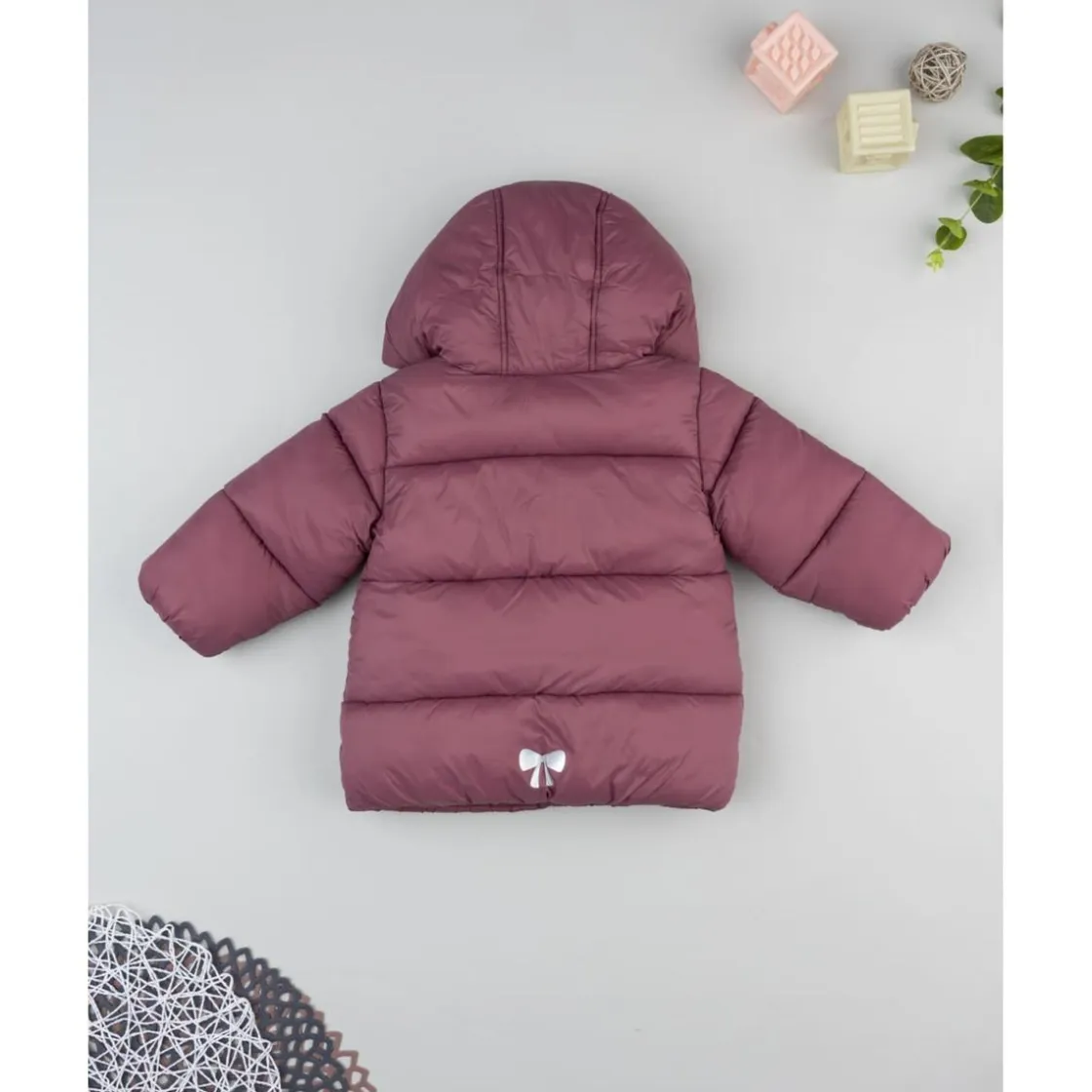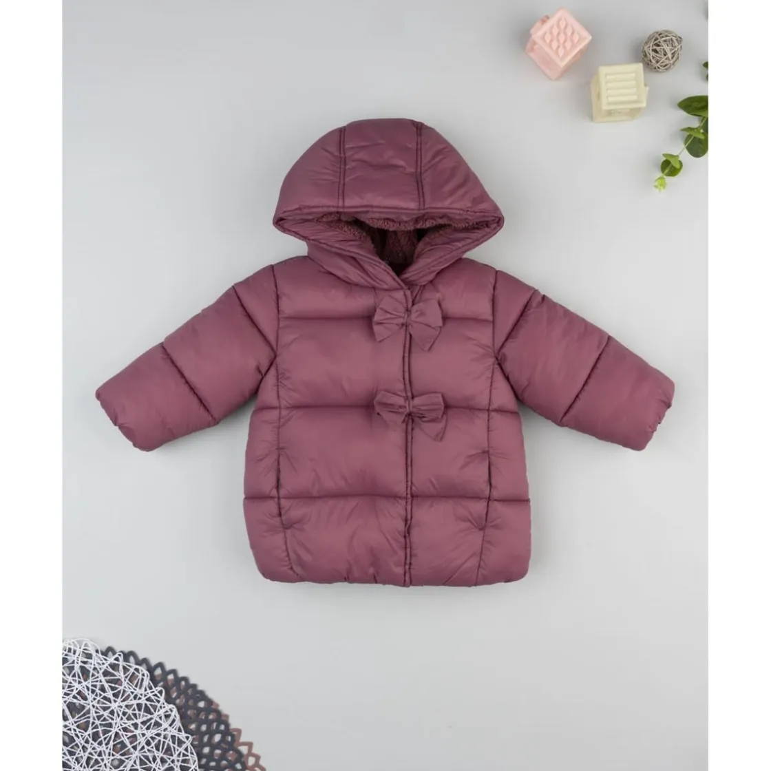 Este plumífero con capucha en rosa antiguo combina dulzura y protección para el invierno. Su interior en pelo sintético suave aporta calidez extra, mientras que los lazos decorativos añaden un toque femenino.
