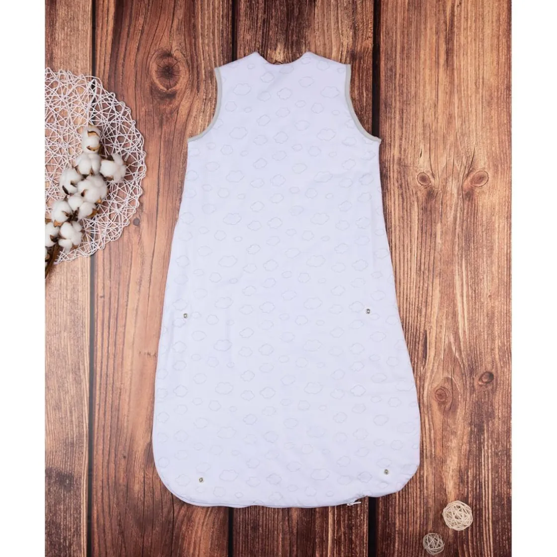 Tierno saco de dormir en jersey blanco con estampado de conejitos grises. Cierre con cremallera frontal, suave y cómodo. Ideal para mantener al bebé calentito con estilo.