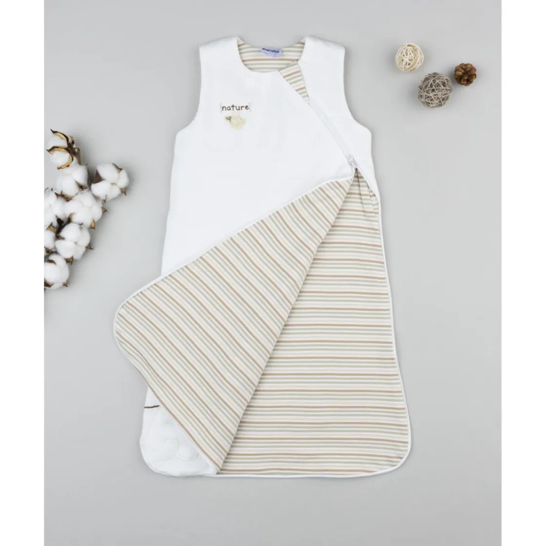 Dulce saco de dormir para bebé. Prenda en base crema con estampado de león en tono coordinado. Uso práctico y manejable gracias a cremallera frontal en línea transversal. Fabricado en algodón oeko-tex, probado para sustancias nocivas que asegura alta seguridad. Accesorios no incluidos. El paquete contiene solo la prenda de vestir.