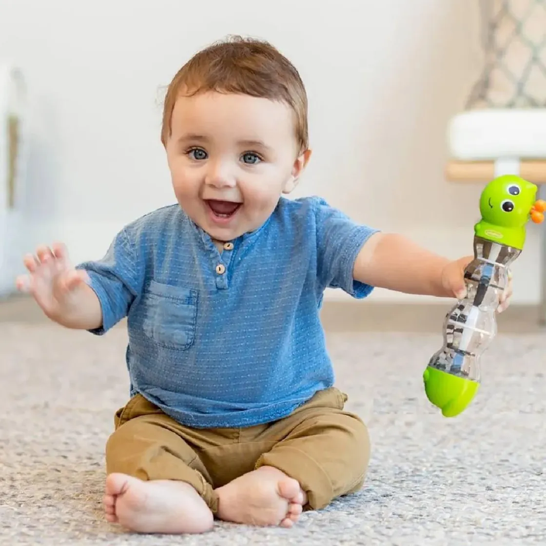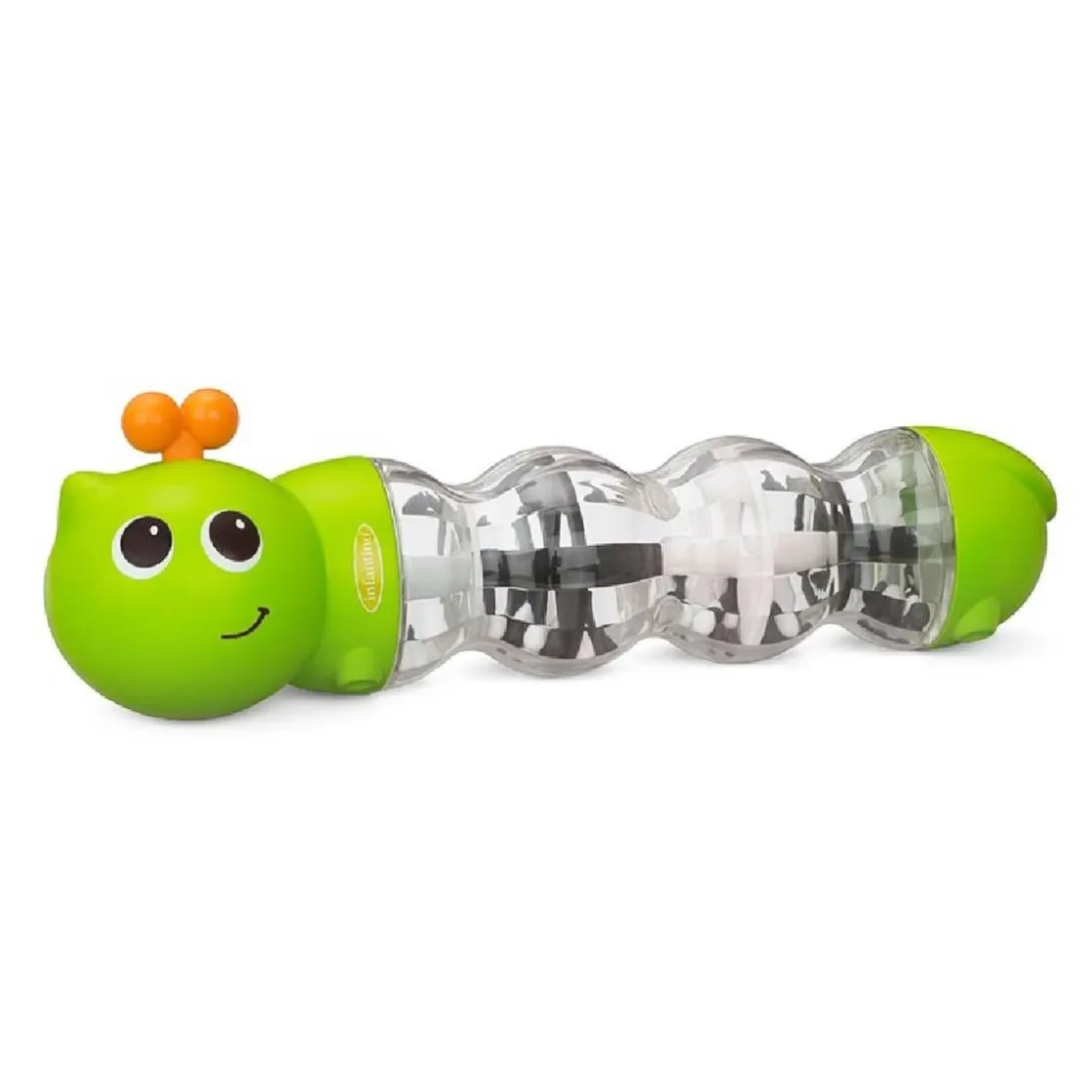 Observa la fascinación del bebé mientras hace rodar la oruga por el suelo. A los niños pequeños les encantará agitar este juguete y escuchar los sonidos que produce.