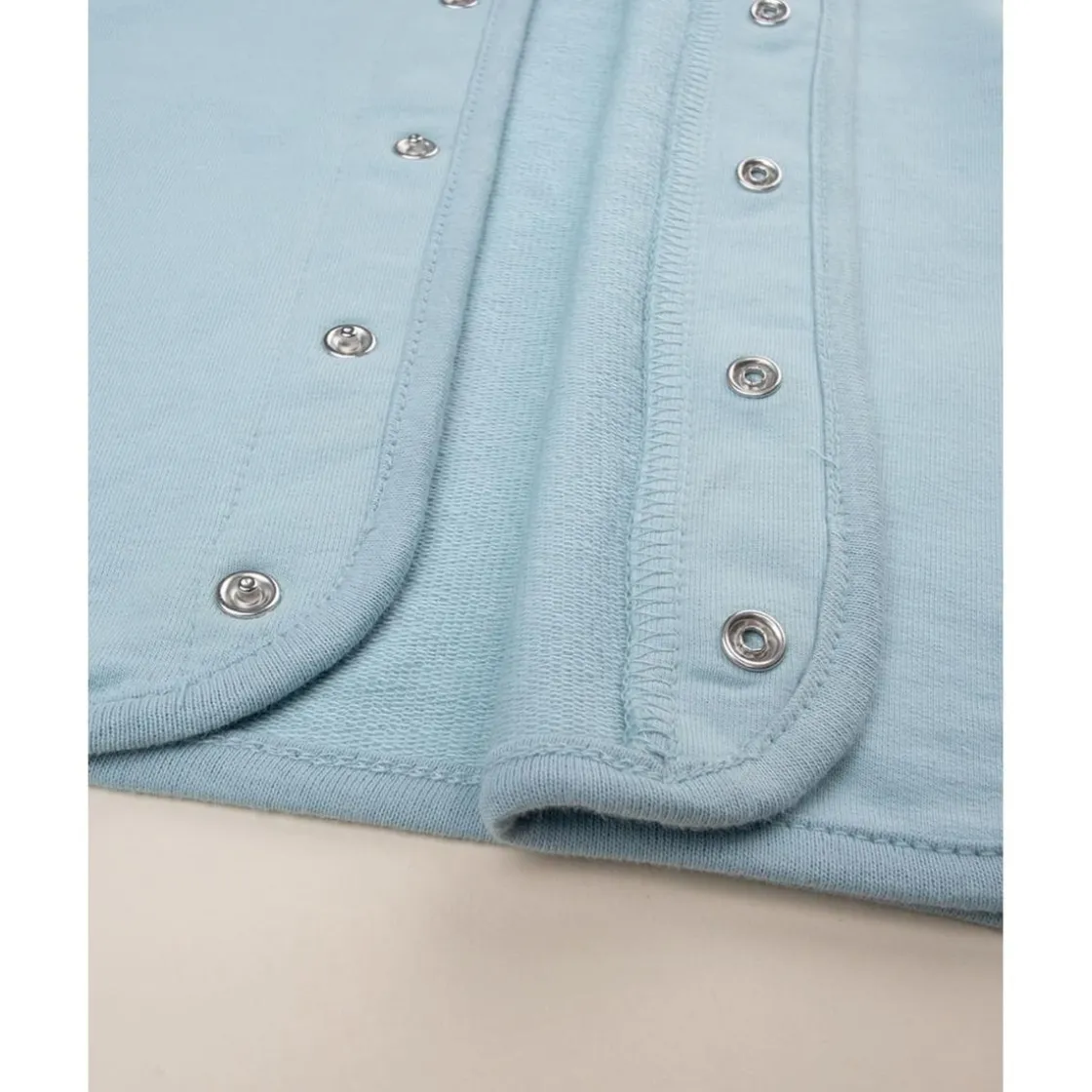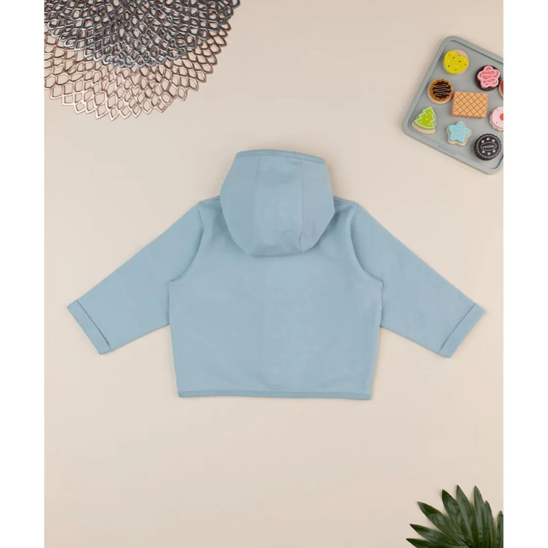 Sudadera con capucha para niño en color azul celeste. Presenta botones automáticos en la parte frontal para facilitar su colocación. Una prenda práctica y cómoda, ideal para el uso diario y combinaciones informales.