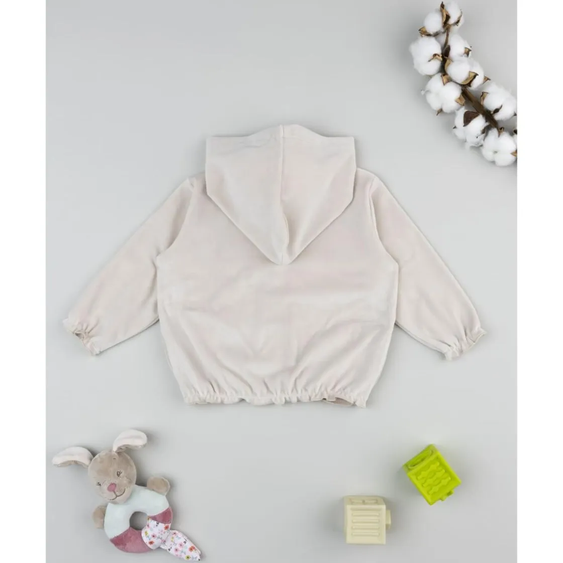 La sudadera en terciopelo beige para niña es una prenda básica y cálida para los meses más fríos. Con capucha, bordado decorativo y cremallera frontal, combina comodidad y estilo en una sola pieza.