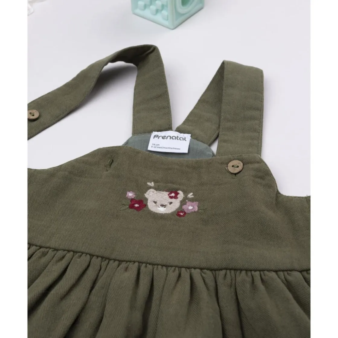 El vestido pichi verde con bordado es una prenda versátil y encantadora para el día a día. Confeccionado en twill de algodón elástico, ofrece un tacto agradable y una gran libertad de movimiento. Presenta un diseño tipo peto con tirantes ajustables y bolsillos frontales, decorado con un discreto bordado en tono coordinado. Su estilo natural y cómodo lo convierte en un básico ideal de entretiempo.
