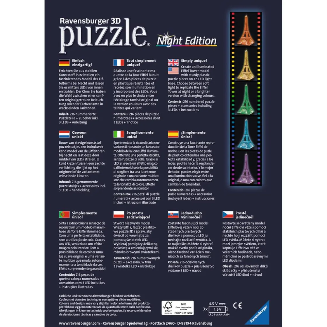 Ravensburger – Puzzle 3D Torre Eiffel Night Edition, un puzzle de 216 piezas de plástico y con luces LED de colores cambiantes. La Torre Eiffel en 3D y con luz. Dimensiones puzzle montado: 16,5 x 16,5 x 47 cm (ancho x largo x alto). Incluye instrucciones. Funciona con 3 pilas AAA. Pilas NO incluidas. Edad recomendada: +12 años.