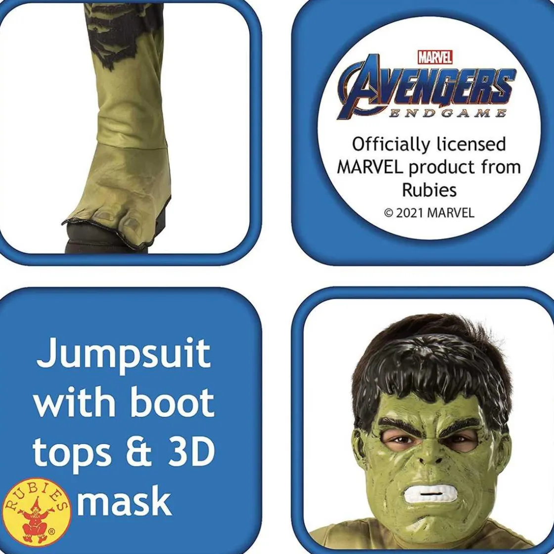 Este Disfraz Infantil Hulk Endgame Classic viene con una máscara de plástico que añade el toque final perfecto. Además, como producto oficial de Marvel Endgame de Rubie’s, este disfraz ha sido probado según todas las normas europeas y británicas requeridas, incluyendo EN71 y REACH, para ofrecer la mejor calidad y seguridad a los niños que lo usen.