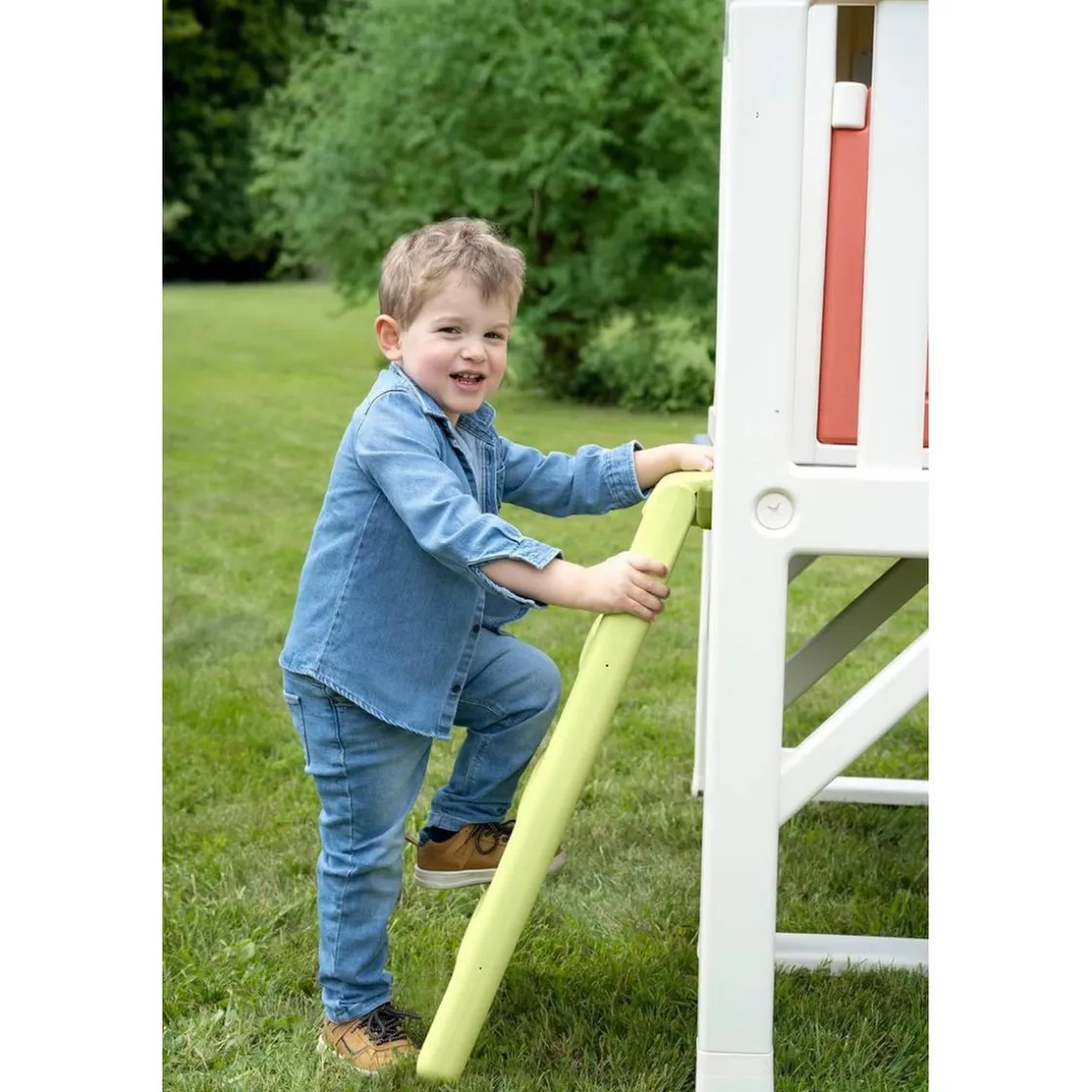 Los niños pueden trepar fácilmente a su refugio a través de una escalera, donde podrán observar el entorno gracias a las ventanas con persianas que se abren y cierran. Esta característica no solo proporciona un toque de realismo al jugar, sino que también estimula la creatividad y el juego de roles.