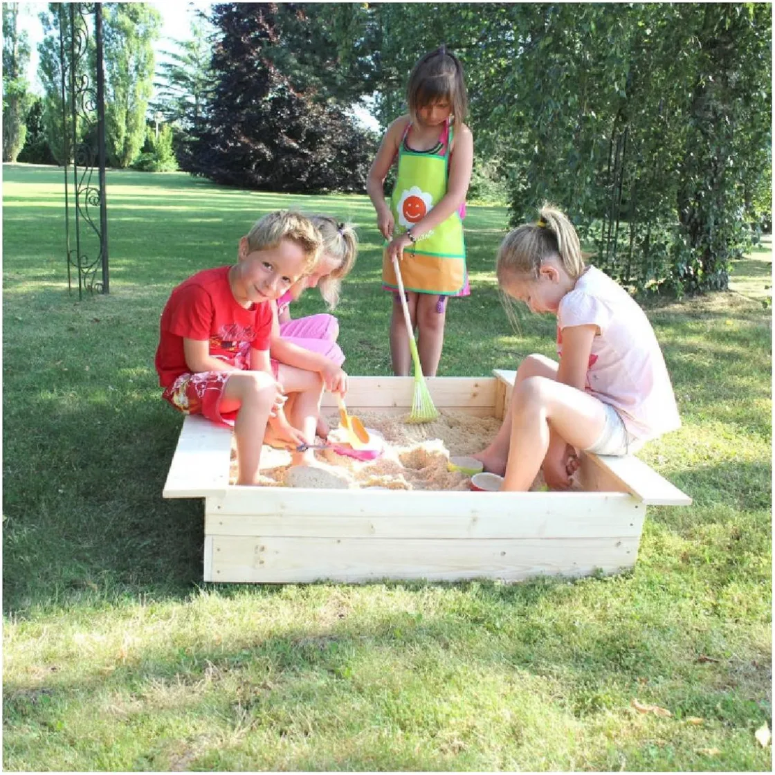 Fácil de montar, se entrega en kit con madera pretaladrada. Las dos lonas incluidas proporcionan una mejor protección contra la lluvia y la humedad del suelo. Una vez montado llénelo con arena (no incluida) y ¡a jugar!
