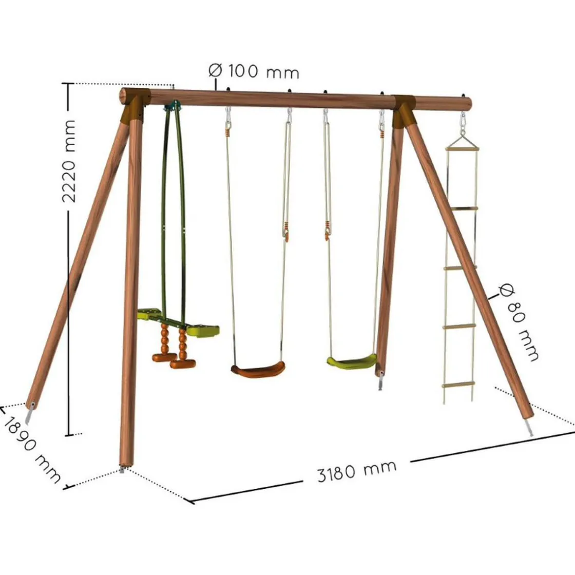 Se trata de un columpio de madera tratada con autoclave IV marrón. Es ideal para una casa con jardín, y para peques de 3 a 12 años.