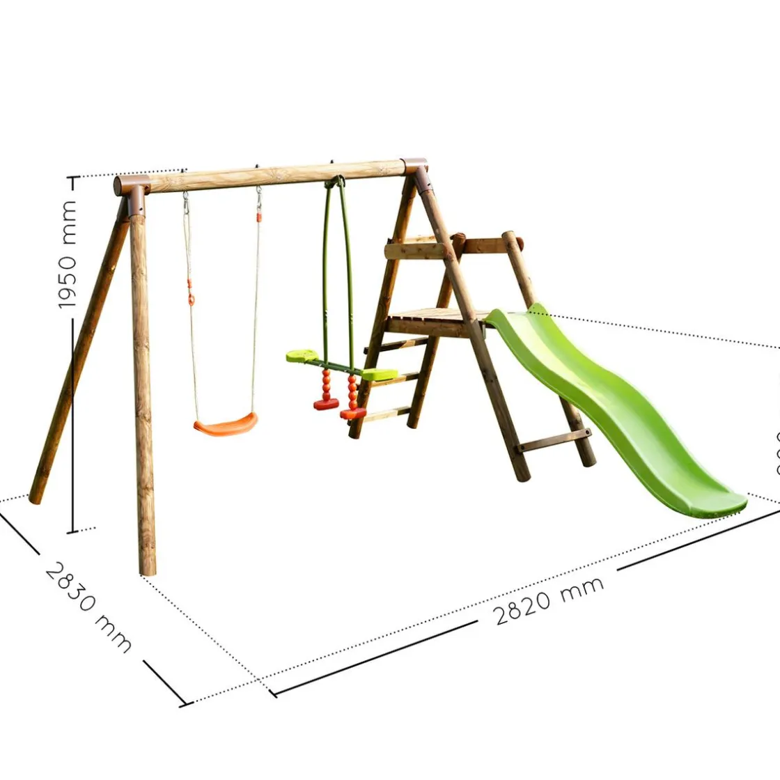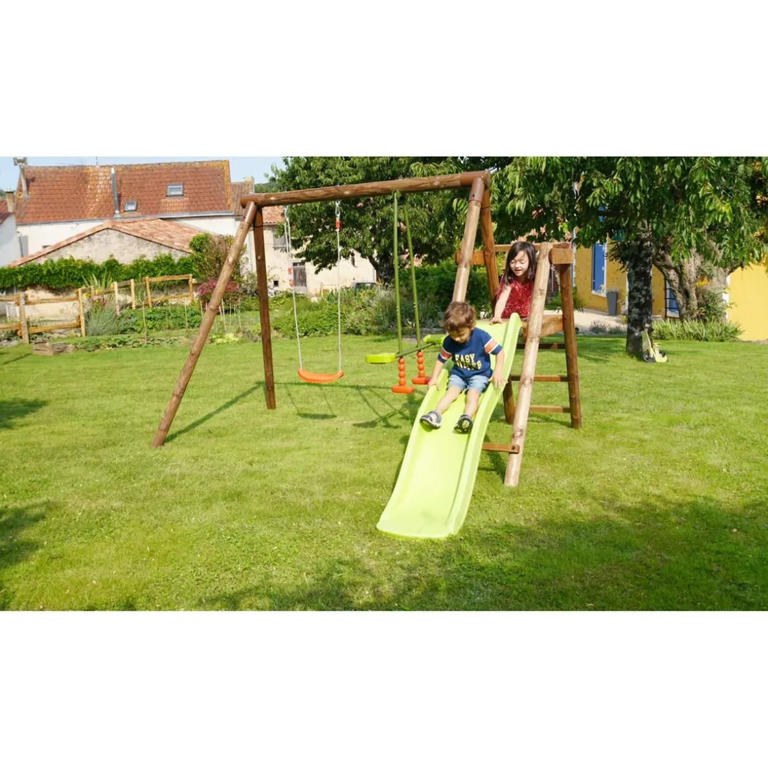 Se trata de un columpio de madera tratada con autoclave IV marrón. Es ideal para una casa con jardín, y para peques de 3 a 12 años.