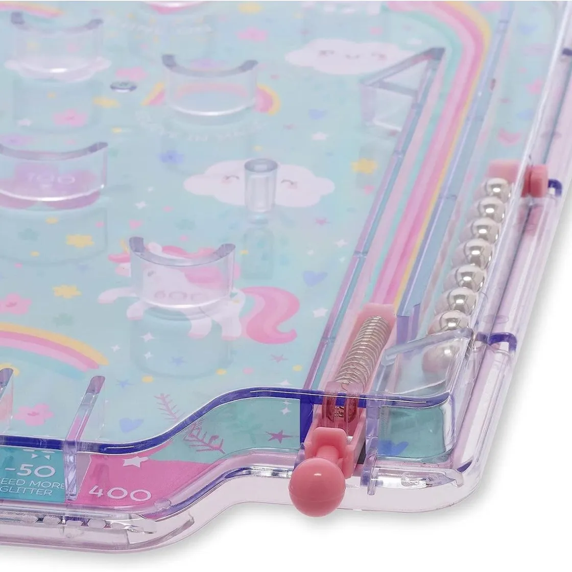 El «Mini pinball portátil tema unicornio» es perfecto para los pequeños amantes de los juegos clásicos. Este pinball portátil alegre y divertido tiene una temática de unicornio que seguro encantará a cualquiera que juegue con él. Es una versión en miniatura del clásico juego de pinball, por lo que puedes llevarlo a cualquier sitio y jugar en cualquier momento.