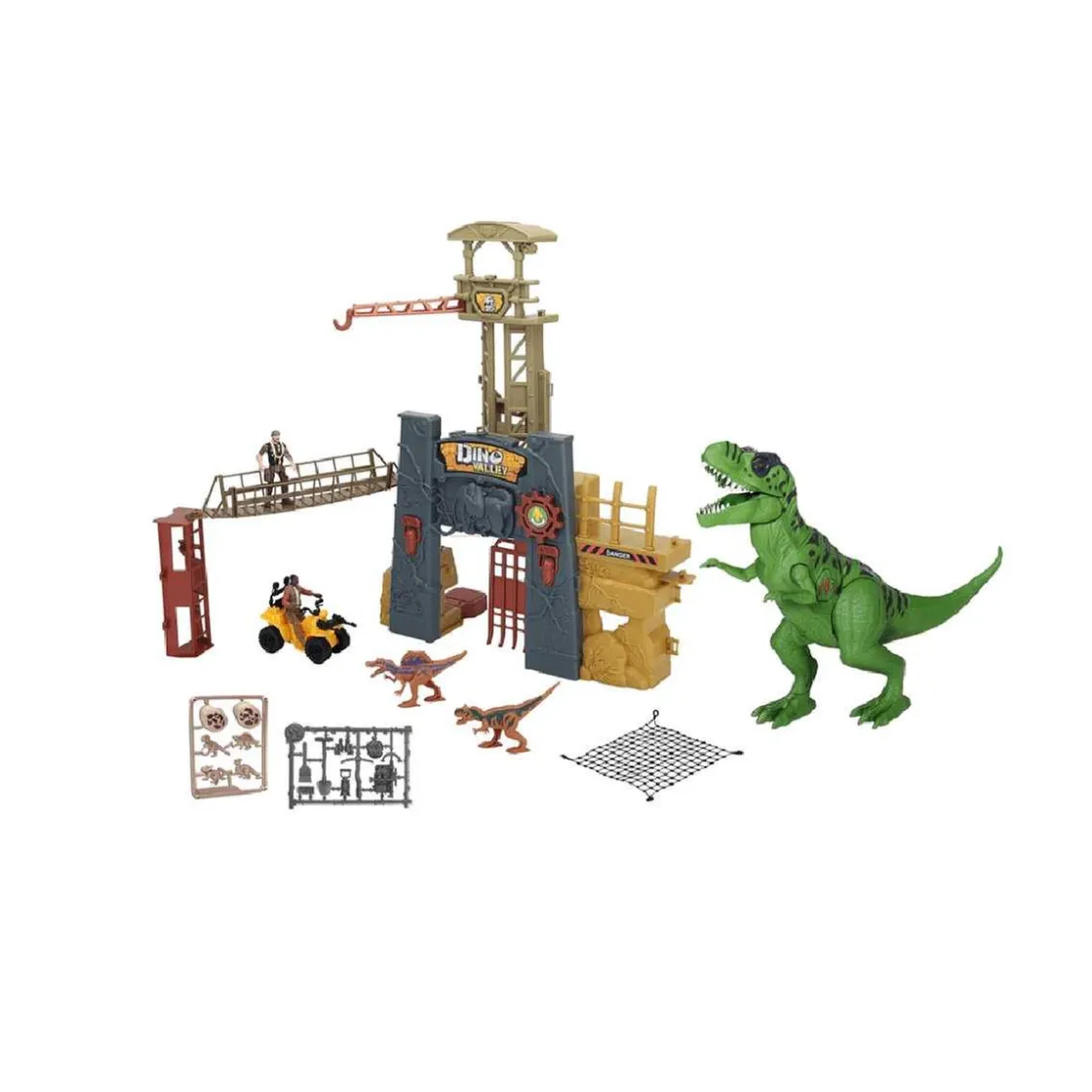 Dino Valley – Fortaleza con torre y tiranosaurio, un playset de Dino Valley cuyo protagonistas es un Tyrannosaurus rex de 40 cm.