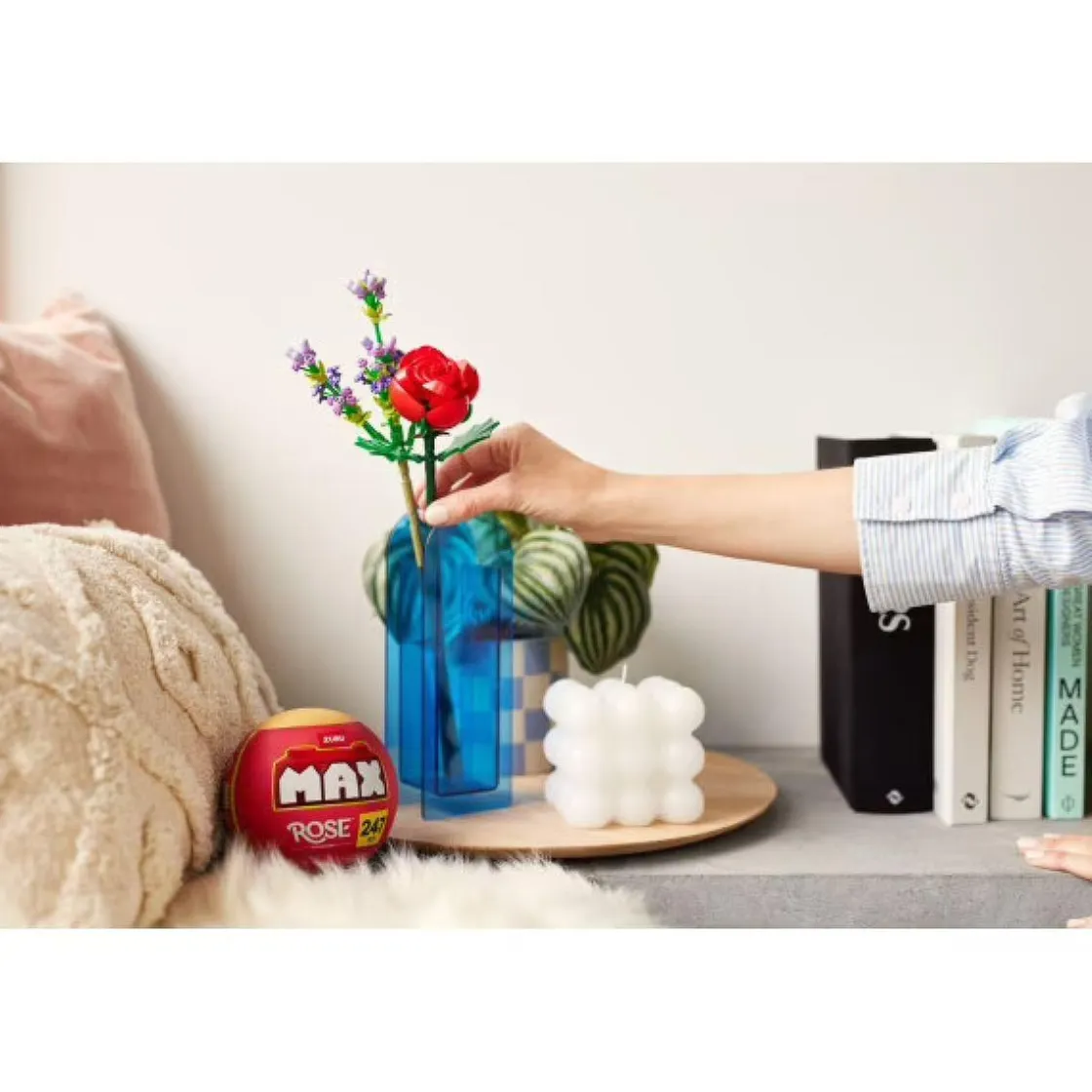 MAX – Cápsula con Rosa y Lavanda, un kit de construcción compuesto por 247 piezas para construir 2 flores de tallo largo, una rosa y una ramita de lavanda, que parecen reales.
