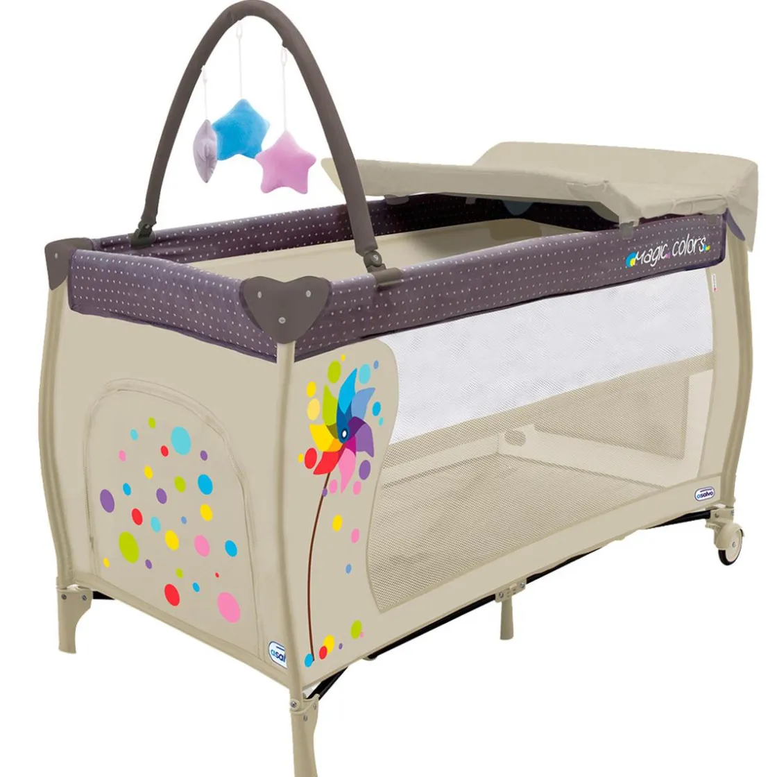 Asalvo – Cuna Mix Plus – Molinillo, de aluminio, plástico y nylon, incluye estructura y textiles, arco de juegos, base acolchada, doble altura, cambiador, bolsa de transporte y manual de instrucciones. Una cuna de viaje muy completa, con ilustraciones en sus cuatro lados, para niños de hasta 15 kg o 86 cm.