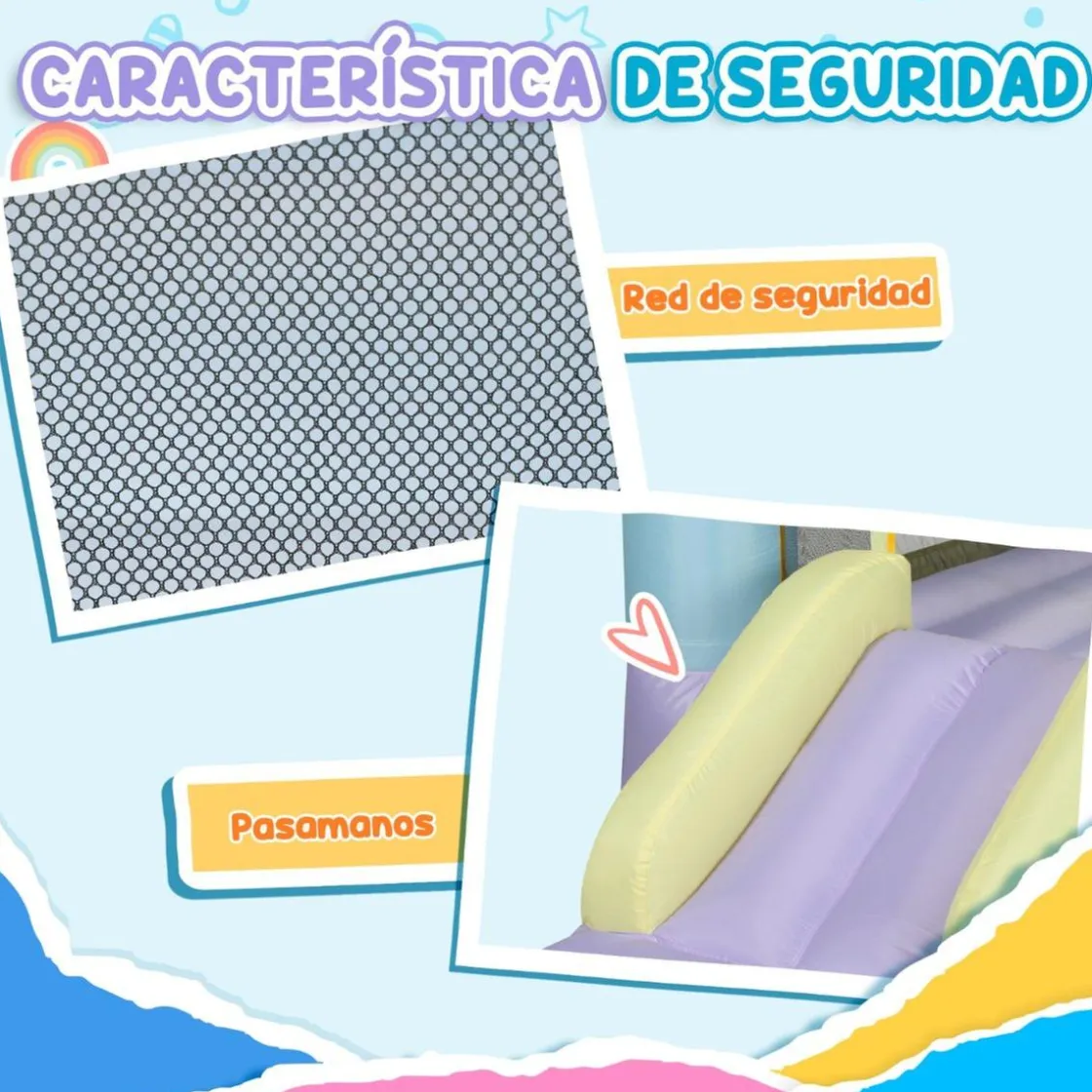- Estabilidad: incluye seis estacas para asegurar el castillo al suelo y garantizar mayor estabilidad durante el uso.
