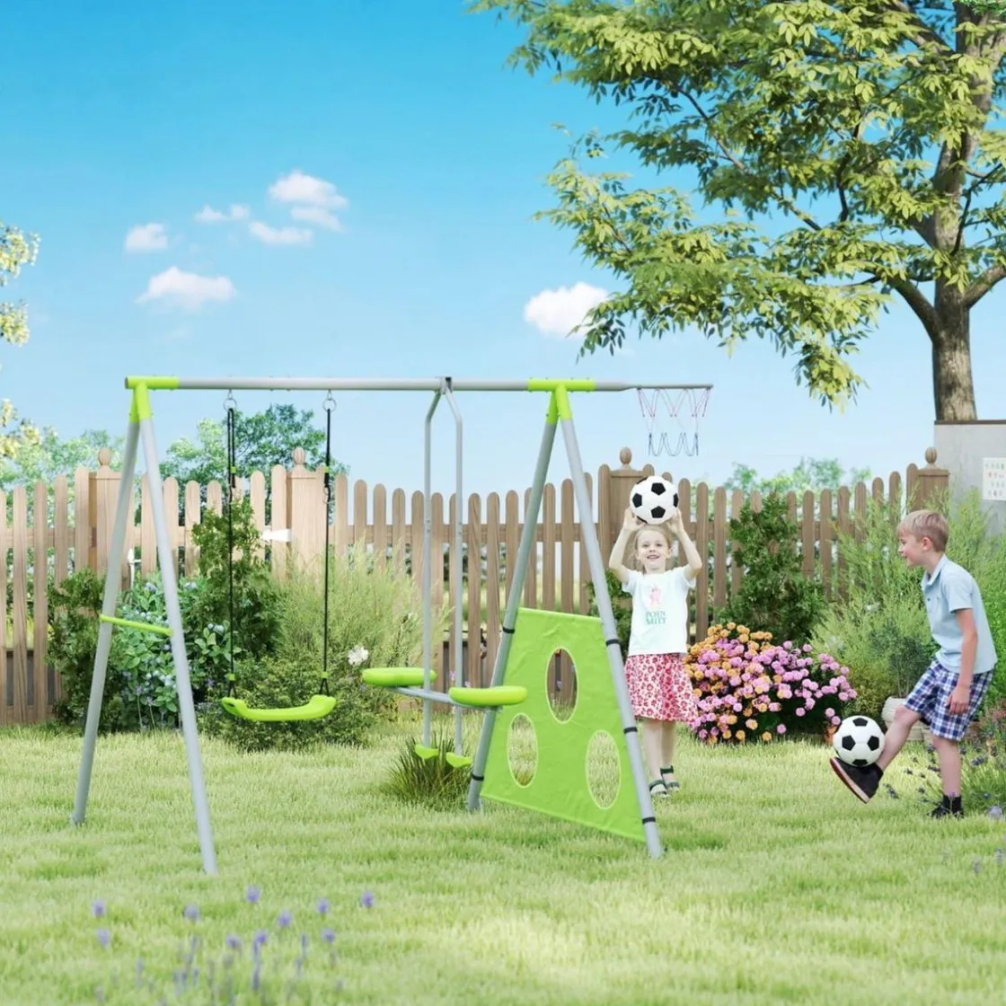 Transforma tu jardín en un auténtico parque de diversiones con el conjunto de columpios Aiyaplay. Su diseño 4 en 1 incluye un asiento de columpio ajustable, un planeador para dos niños y accesorios deportivos, como un aro de baloncesto y una portería de fútbol, ideal para que 3 a 4 niños jueguen juntos. Fabricado en metal con recubrimiento en polvo y PE, es perfecto para disfrutar al aire libre en cualquier clima.