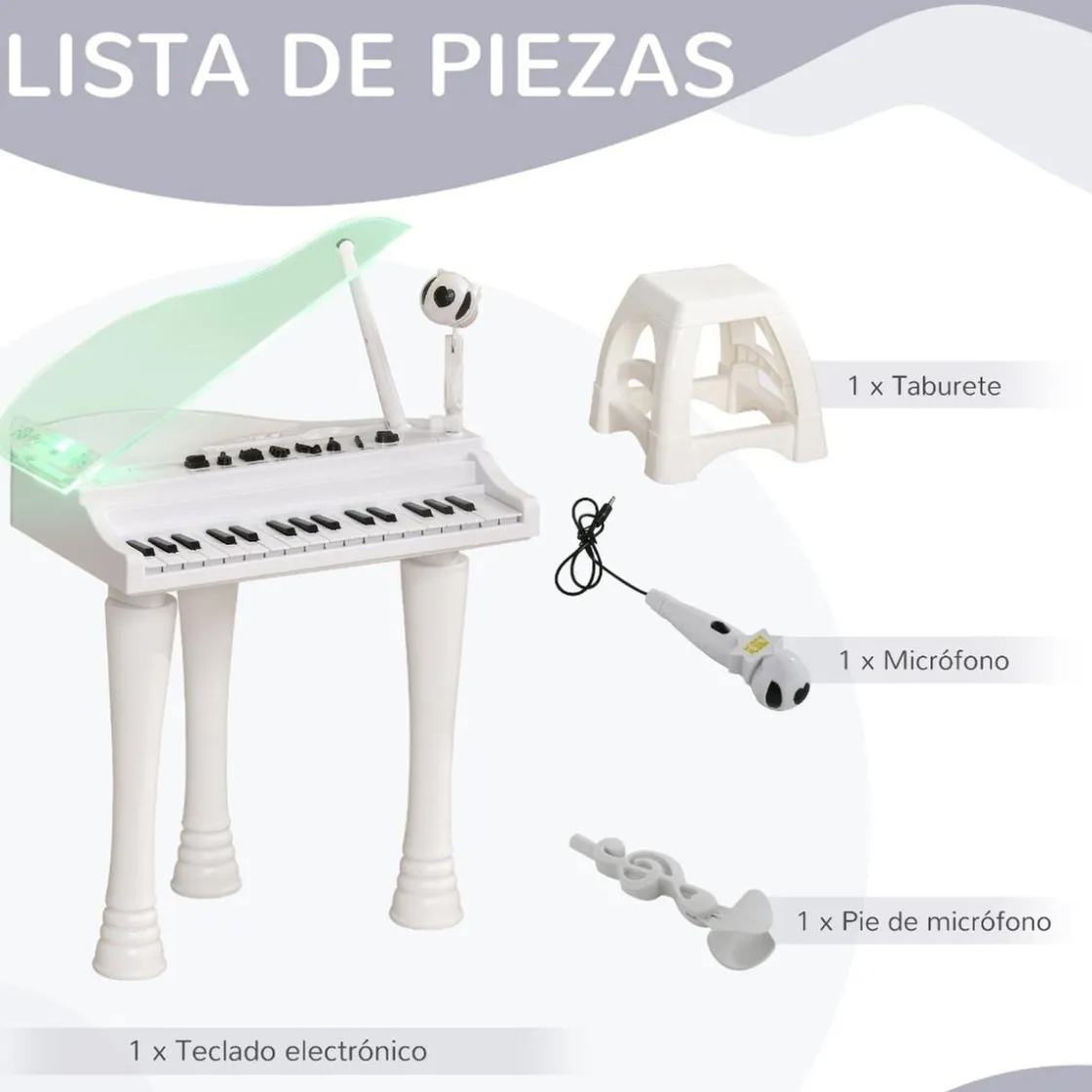- Piano de juguete con 22 melodías y 4 tonos, además de un micrófono amplificado.