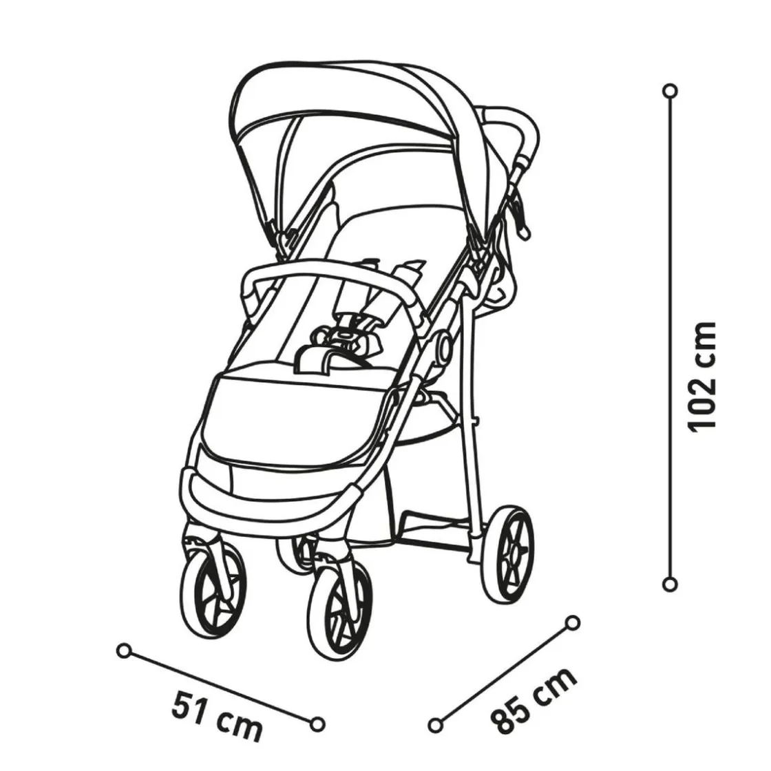 - 1 silla de paseo ligera con chasis robusto y fácil plegado de una sola mano.