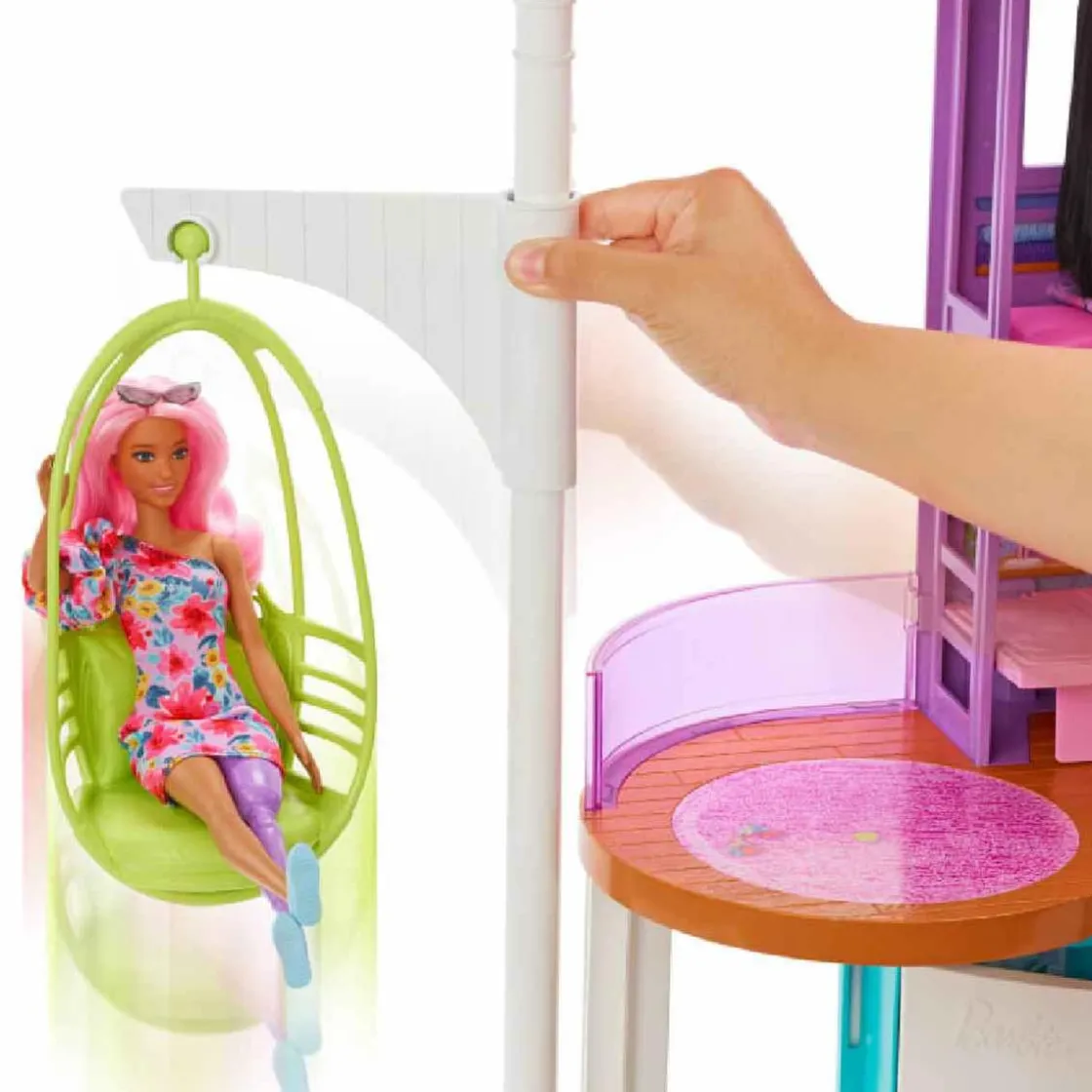 La casa de 2 pisos cuenta con dormitorio, baño, cocina, comedor, sala de estar y armario con acabados modernos y el estilo emblemático de Barbie.
