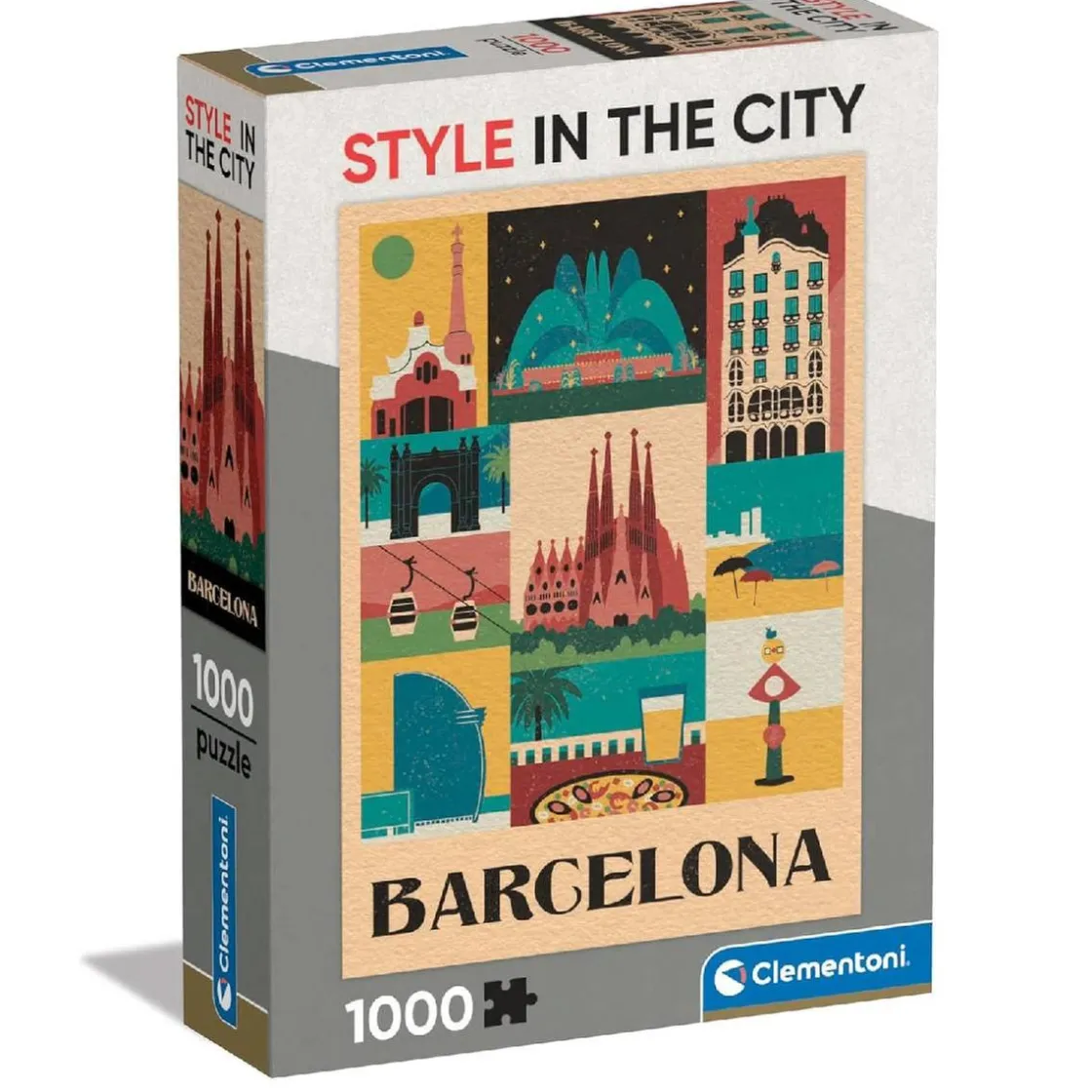 Descubre la belleza de Barcelona con este puzzle de 1000 piezas de la colección Style in the City de Clementoni. La imagen combina colores planos y un diseño moderno que representa los edificios, monumentos y rincones más emblemáticos de la ciudad condal.