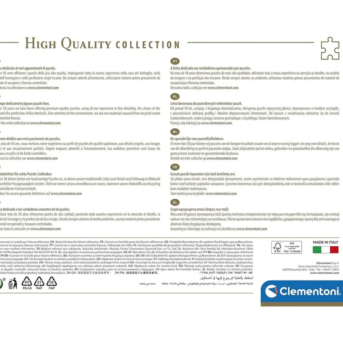 Fabricado en Italia por Clementoni, una empresa reconocida por su calidad, este puzzle cuenta con cortes precisos que garantizan un perfecto encaje de cada pieza. Confía en la experiencia y la destreza que ofrece Clementoni.