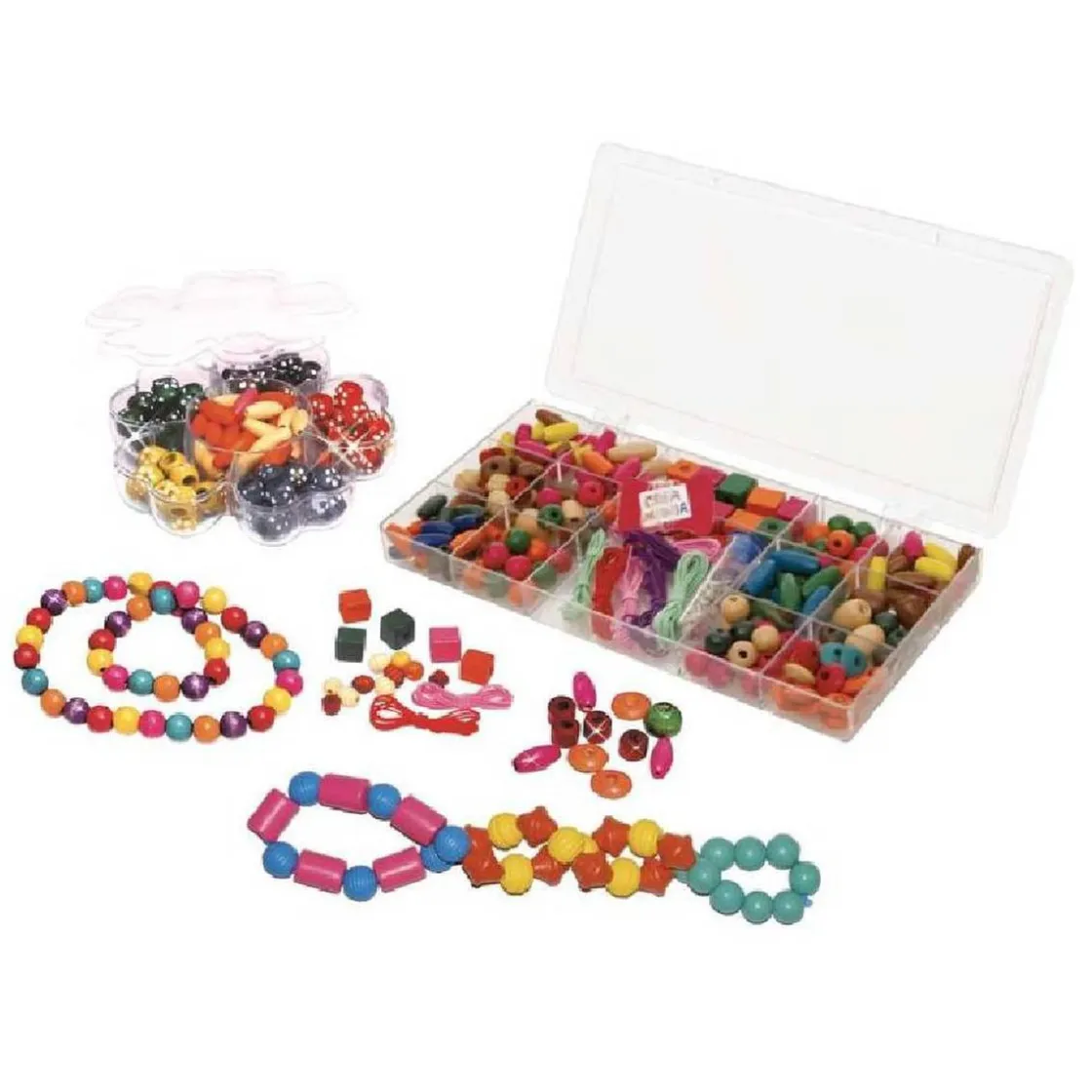 La caja creativa incluye: 200 cuentas de madera, 1 caja con forma de flor, 1 caja rectangular, 9 hilos de colores.