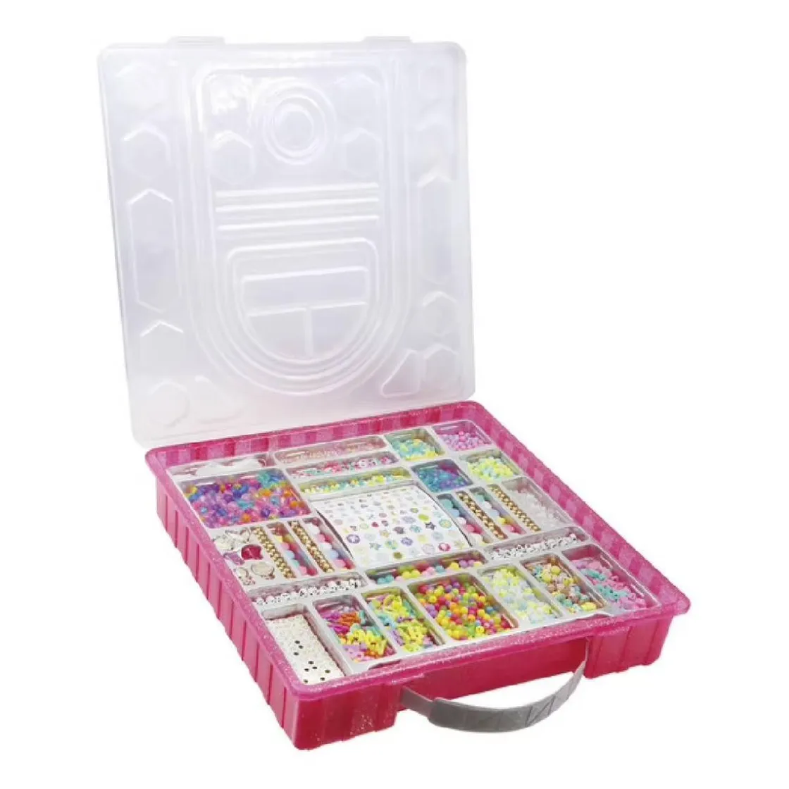 Esta maleta creativa contiene más de 3000 cuentas de diversas formas, tamaños y colores, así como numerosos dijes y colgantes. También incluye letras del alfabeto para que tu hijo pueda escribir nombres, mensajes o sus iniciales, haciendo cada creación única. Para una personalización extra, se incluyen pegatinas decorativas con la maxi maleta de joyas para embellecer los dijes más grandes. El estuche de almacenamiento del set está diseñado para ser tan práctico como divertido.