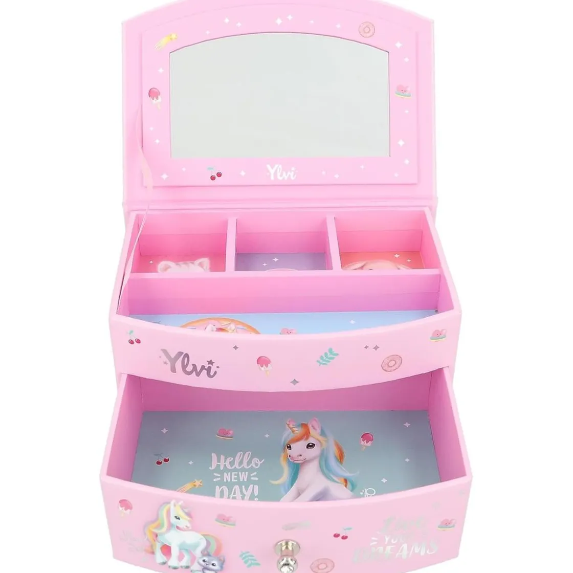 El joyero pequeño Ylvi rosa es perfecto para guardar y organizar tus joyas favoritas y pequeños tesoros. Con un diseño encantador de unicornios y estampados adorables, este joyero no solo es práctico, sino también un bonito accesorio decorativo para cualquier habitación. Su tapa abatible incluye un espejo en el interior para facilitar la visualización de tus joyas mientras te arreglas. Además, cuenta con un cajón amplio y compartimentos adicionales, permitiendo que cada objeto tenga su lugar específico.