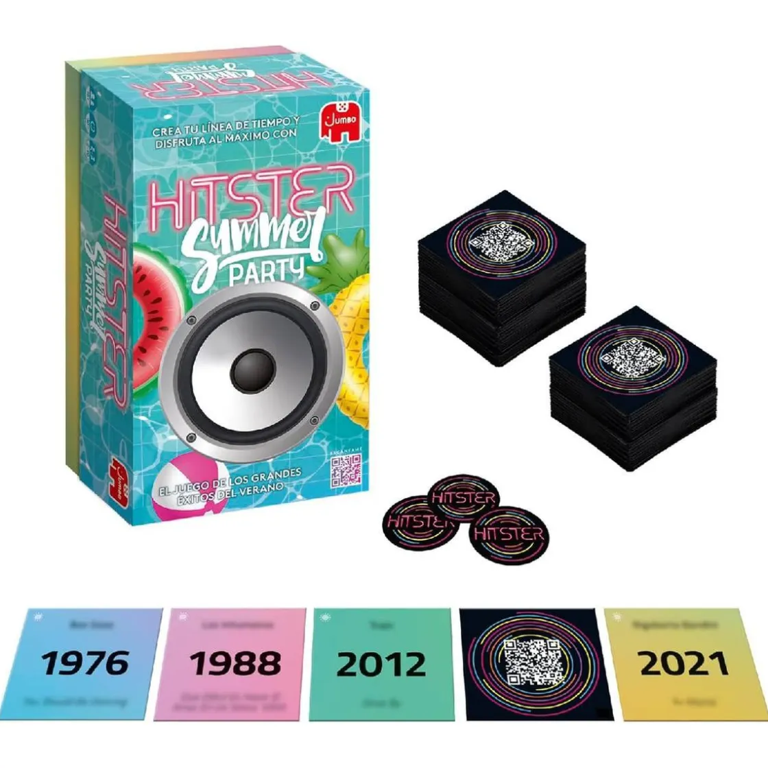 Hitster Summer Party (castellano), una expansión para el juego de cartas Hitster con que escucharás más de 100 años de éxitos increíbles, ordénalos por orden cronológico en la línea del tiempo y disfruta del viaje.
