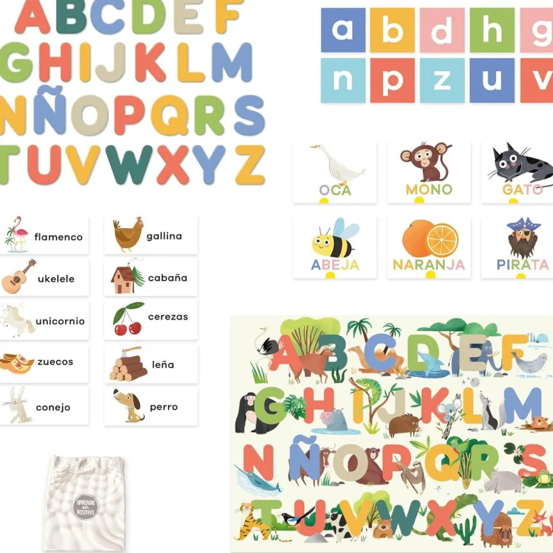 Este juego no solo incluye las letras y las tarjetas ilustradas, sino también un práctico póster con el abecedario y una guía visual del contenido que sirve como referencia rápida para los niños. Y para que todo se mantenga en orden, todo el material puede guardarse en una cómoda bolsa de tela.