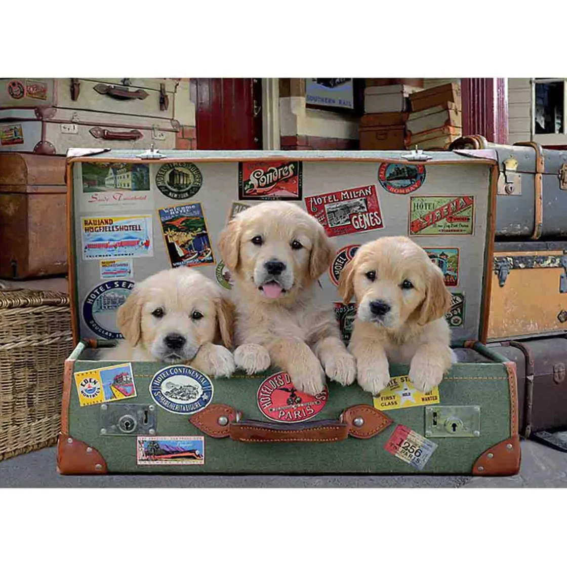El puzzle representa una tierna escena de tres cachorritos de perro metidos en una maleta.