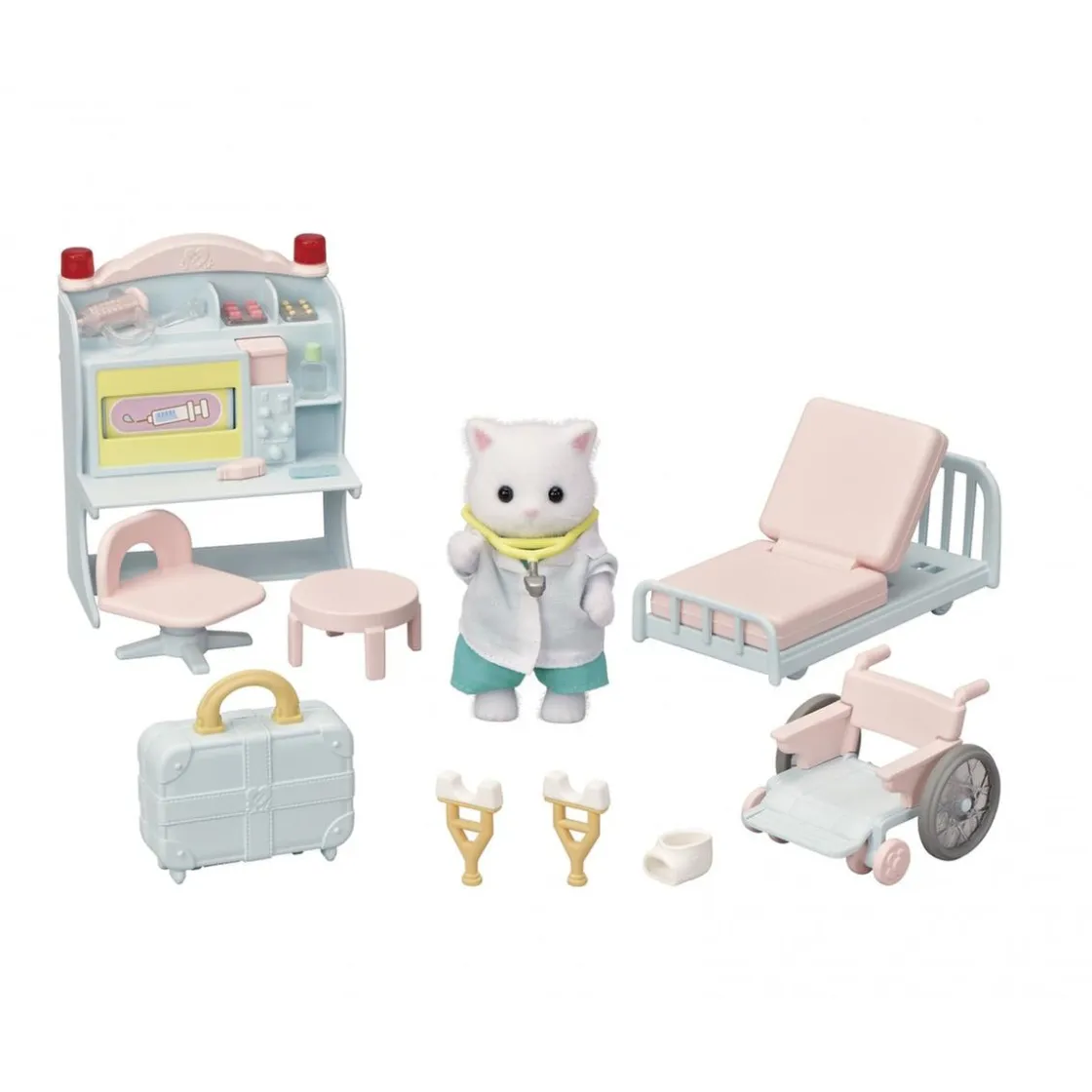 Este set incluye una figura de adulto con uniforme de médico, mobiliario de clínica, silla de ruedas, muletas, cabestrillo para figura de niños, maletín de doctor y accesorios de médico. ¡Todo lo que necesitas para transformar tu Casa de Campo y el coche en clínica!