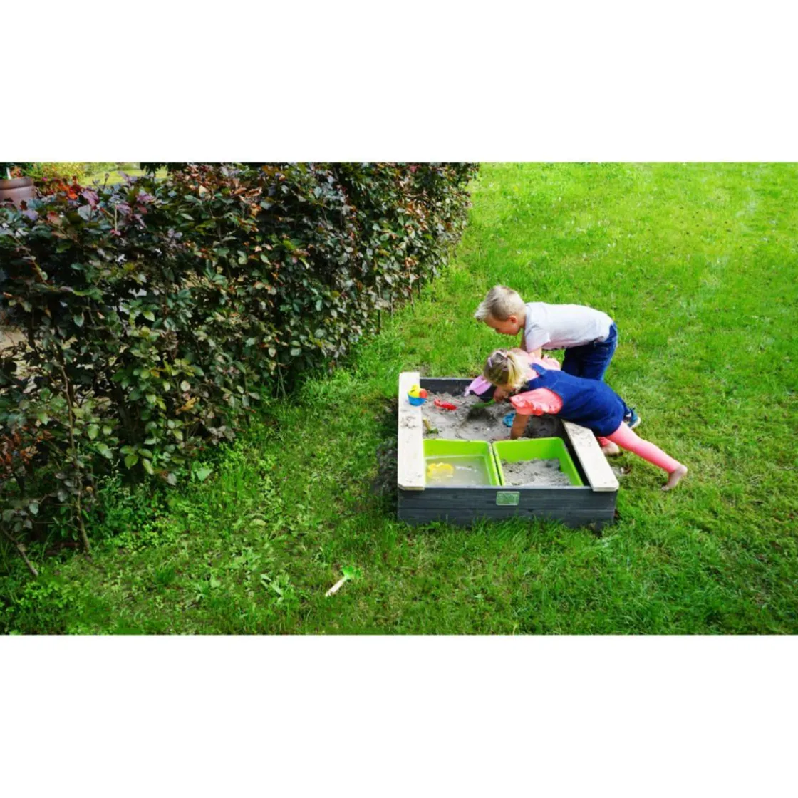 La caja de arena tiene dos contenedores verdes. Los contenedores verdes se levantan fácilmente y, por lo tanto, son fáciles de limpiar.