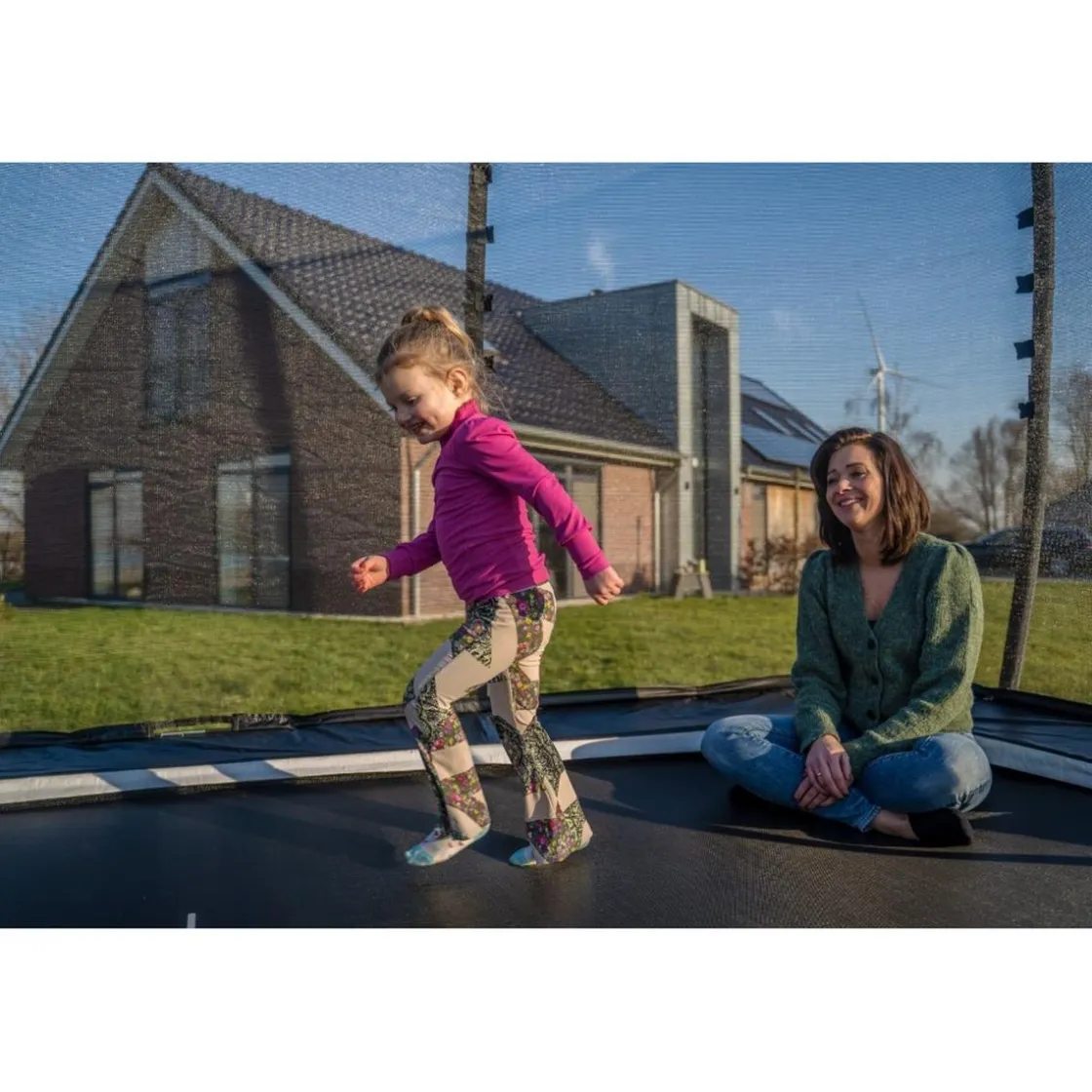 Gracias al sistema de protección para los pies (FPS) de Exit que interpone una red de protección entre la lona de salto y el acolchado del trampolín, los pies de la persona que está saltando nunca quedarán atrapados entre los muelles.