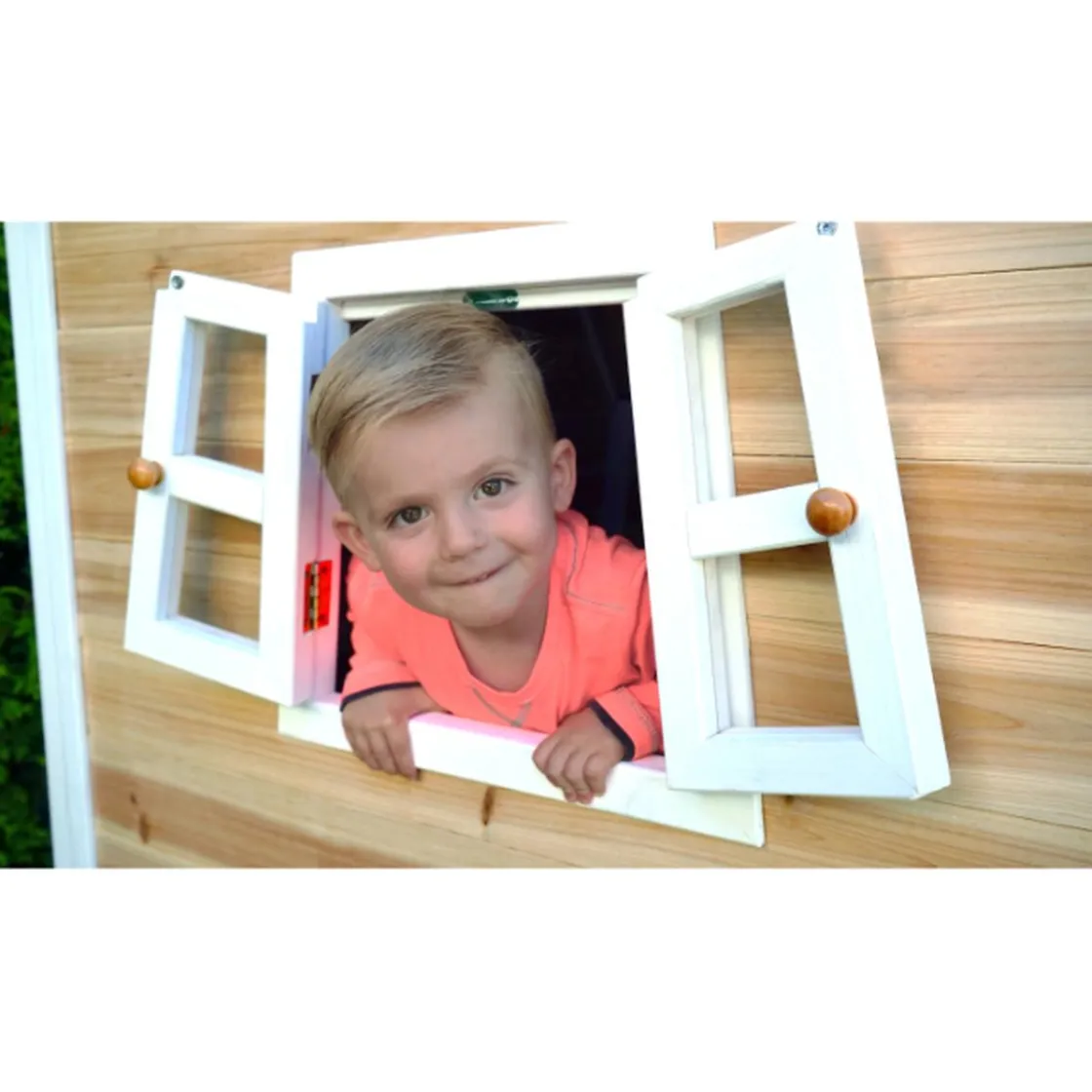 Las casitas de juegos de EXIT Toys están hechas de madera de cedro certificada FSC (FSC 100%, FSC® SCS-COC-007799®). Este tipo de madera no se astilla y es naturalmente resistente a las influencias climáticas como la lluvia y, por lo tanto, resistente a la podredumbre de la madera. No es necesario tratar las casitas de madera EXIT antes de usarlas, los niños pueden jugar de forma segura con ellas desde el principio.