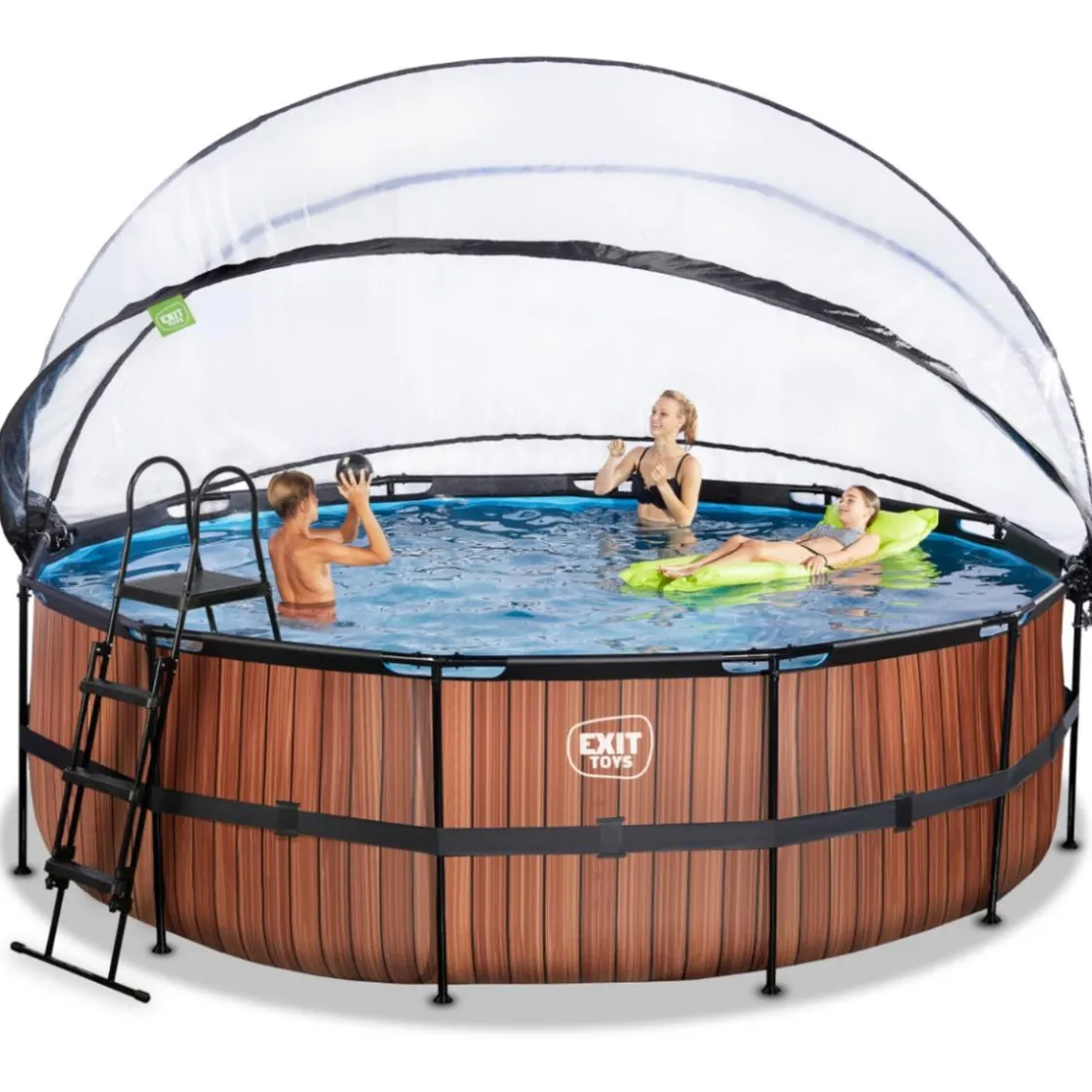 El gran diámetro de la piscina ofrece suficiente espacio para relajarse en un colchón de aire flotante. ¿O prefieres nadar bajo el agua? La piscina Exit Wood tiene 122 centímetros de profundidad y te permite sumergirte en ella.