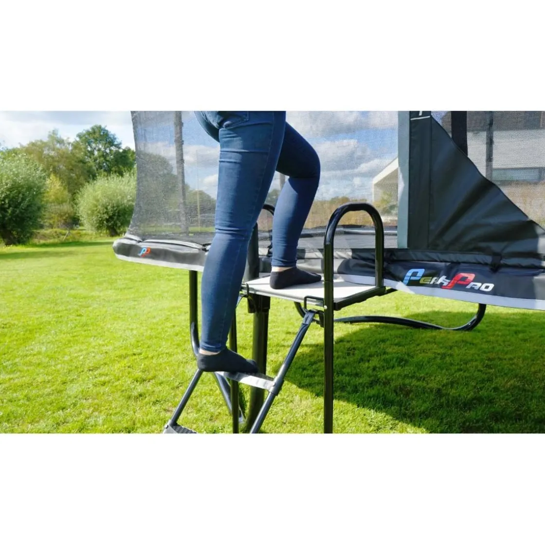 La plataforma de trampolín es un accesorio adicional para ayudarte a subir a un trampolín con escalera de manera segura y sin esfuerzo.