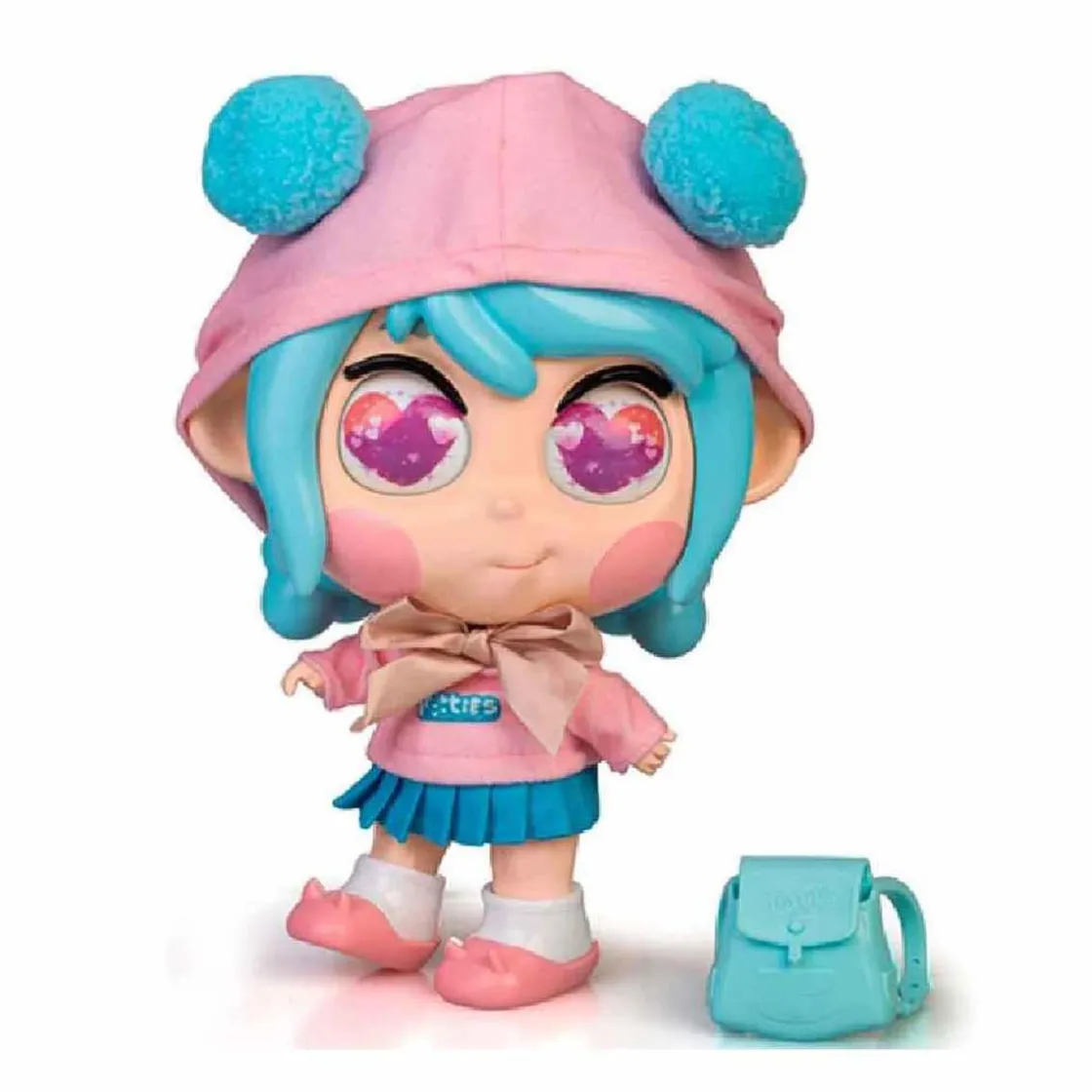 Mia va vestida con un look romántico que incluye un jersey rosa decorado con un lazo beige y una capucha con pompones azules a juego con su pelo. El conjunto se complementa con una falda plisada.