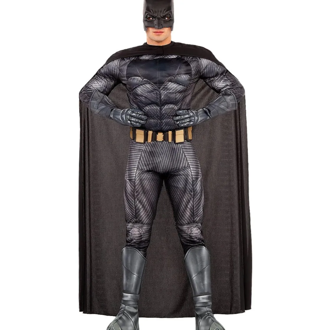 Da vida al Caballero Oscuro con este disfraz de Batman en talla XL inspirado en la Liga de la Justicia. Su acabado musculoso te convierte en el héroe más temido de Gotham.