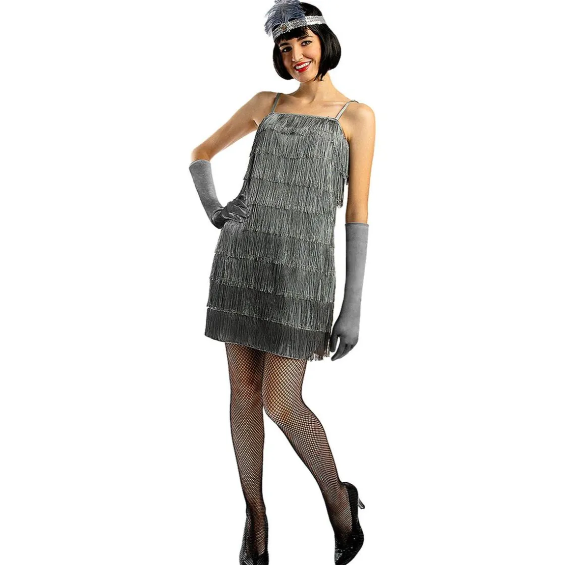 El conjunto incluye un vestido con flecos que se mueven al ritmo de la música, unos guantes largos que añaden un toque de glamour y una cinta decorativa para la cabeza que completa el estilo de la época.