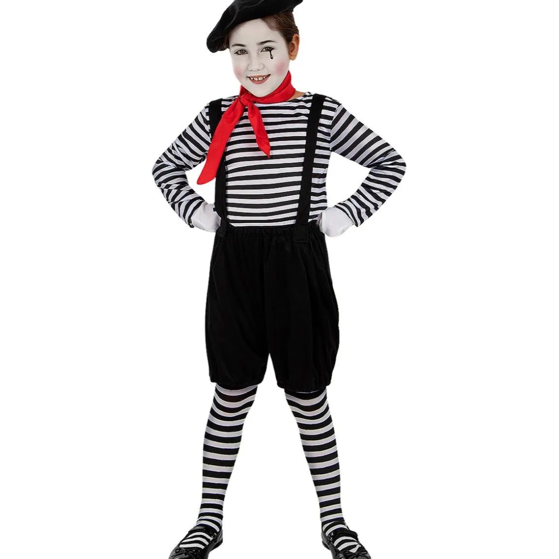 Haz que tu pequeña se convierta en la artista callejera más encantadora con este disfraz de mimo. Incluye un peto de rayas, camiseta blanca de manga larga, una boina negra y un elegante pañuelo rojo. Perfecto para carnaval, fiestas temáticas o espectáculos escolares.