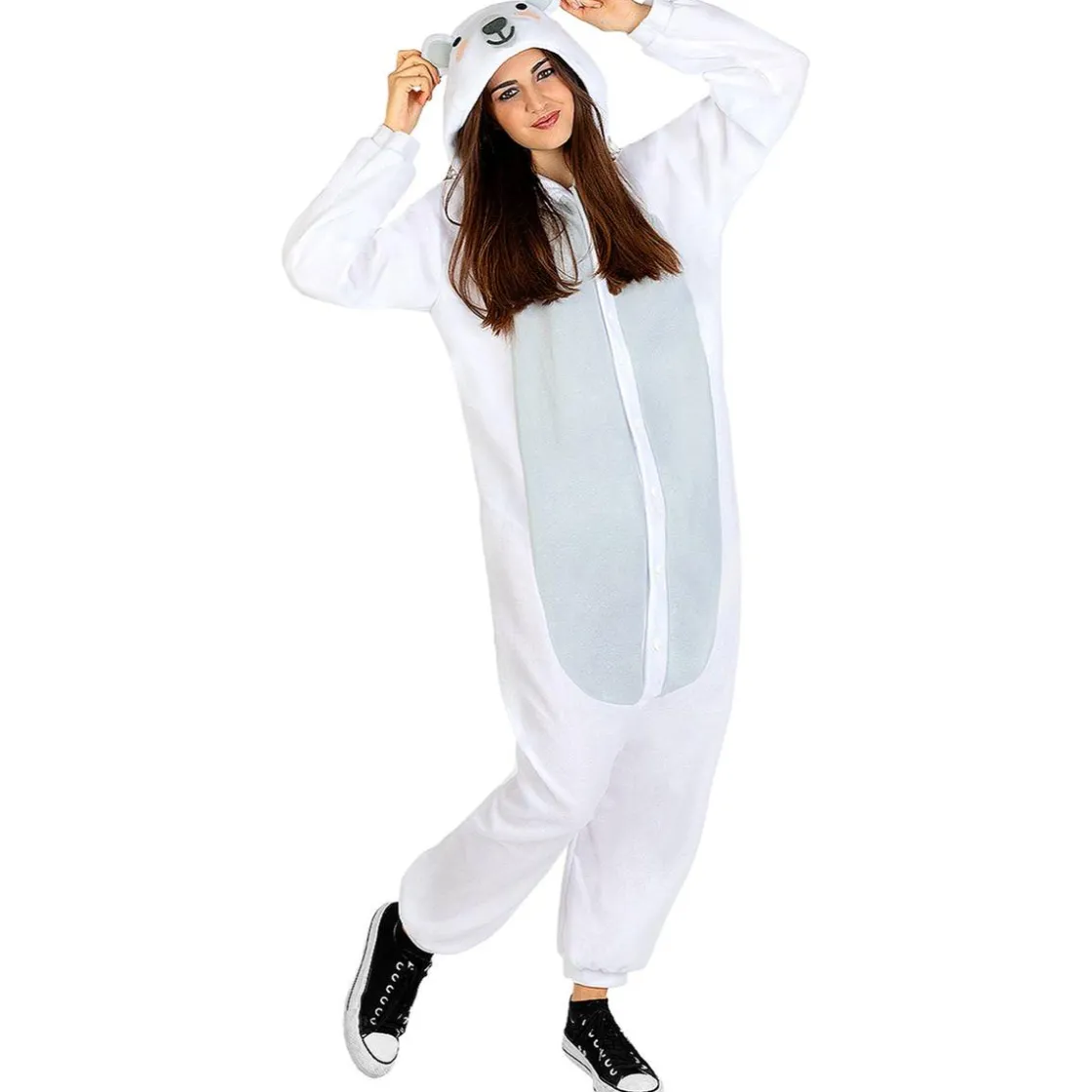 Conviértete en un adorable oso polar con el Disfraz de oso polar onesie para adulto. Este mono confeccionado en 100% poliéster es perfecto para destacar en carnavales o fiestas temáticas. ¡Un look fresco y divertido!