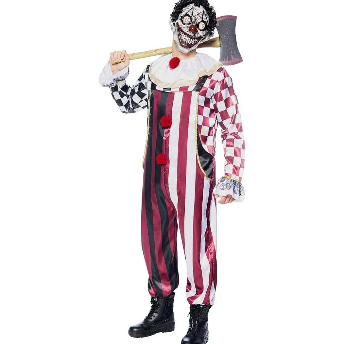 Set XL con mono, camisa, gorguera y máscara con pelo para un payaso cinematográfico. El mono asegura continuidad visual del color; la gorguera arma la silueta y la máscara suma volumen y dramatismo. Ideal para shows, concursos y sesiones de fotos temáticas.