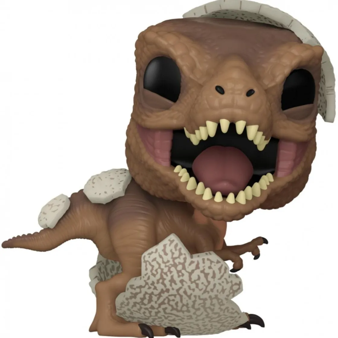 La figura muestra a un pequeño Tyrannosaurus Rex recién salido del huevo, con parte de la cáscara aún adherida en su cabeza. Su textura imita grietas del cascarón roto, y el reptil aparece con pose curiosa, cuello erguido, boca entreabierta a modo de rugido suave. Los detalles del vinilo resaltan pliegues de piel, ojos grandes y mirada alerta para capturar ese instante tan icónico.