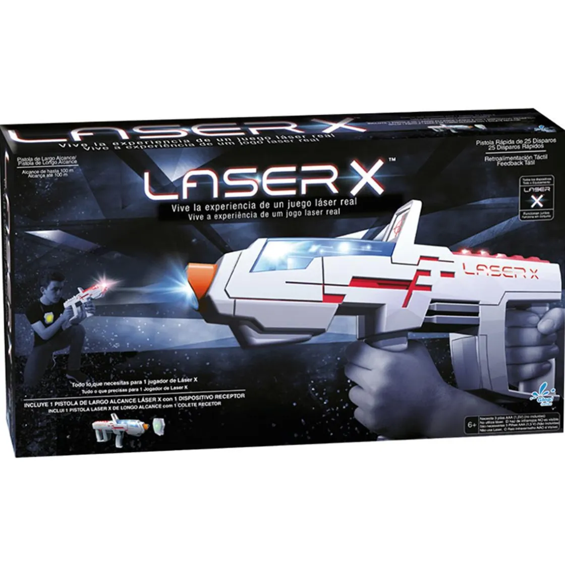Pistola Laser X Individual ahora la distancia ya no será un problema en las batallas de Laser X ¡La Pistola Laser X de Largo Alcance te permite llegar aún más lejos! Si tu blanco está a 100 metros de distancia, dispara porque podrás alcanzarlo. Tira del cargador hacia atrás de tu Pistola Laser X de Largo Alcance para recargar y apunta a tu adversario, del equipo rojo o azul ¡Y ten cuidado de que a ti no te den! ¡Cada minuto que pases sin recibir un disparo podrás conseguir un punto adicional, así que protégete bien! ¿Estás listo?