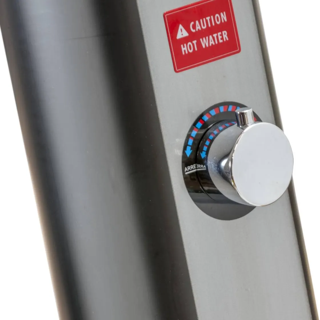 Esta ducha solar es ideal para instalar en el jardín o cerca de la piscina y disfrutar de agua caliente de forma rápida.