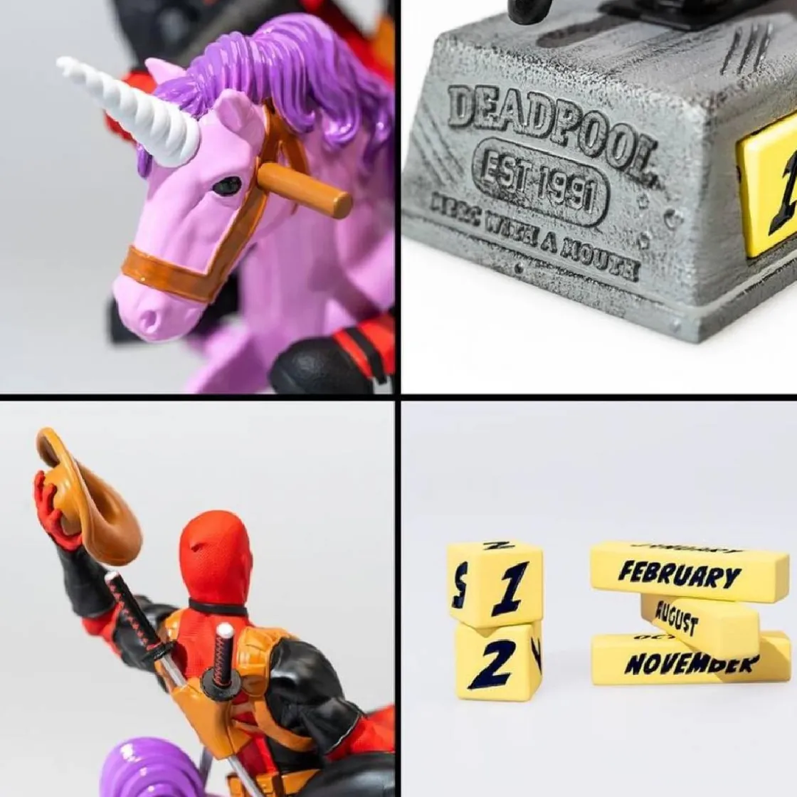Marvel – Calendario Perpetuo 3D Deadpool Unicornio , un producto distintivo y novedoso, que combina la popularidad del icónico personaje de Marvel, Deadpool, con la inusual imagen de un unicornio, creando así una pieza única de decoración funcional.