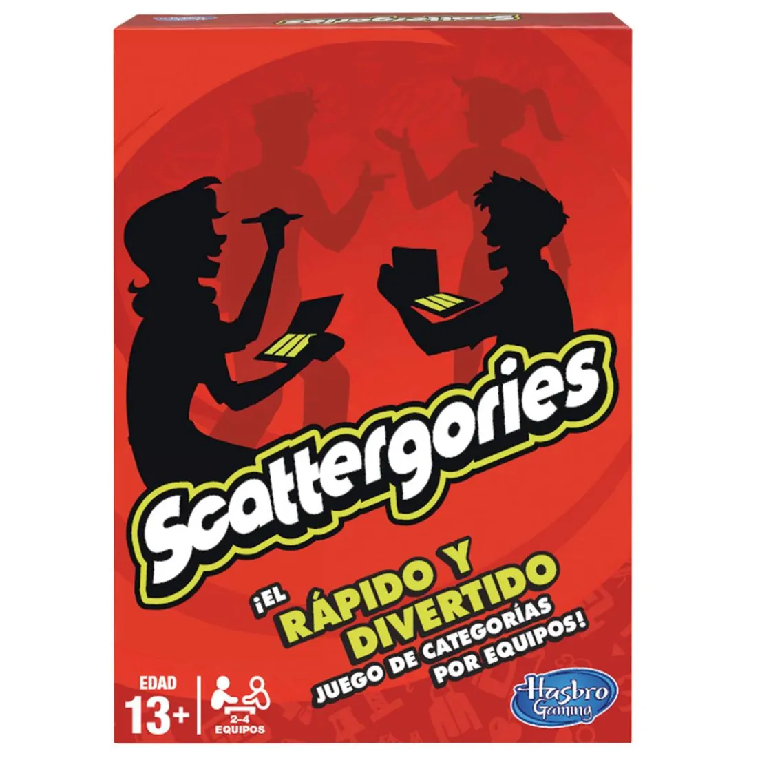 Scattergories, un juego de mesa de palabras que incluye 1 dado de 20 caras y 4 carpetas.